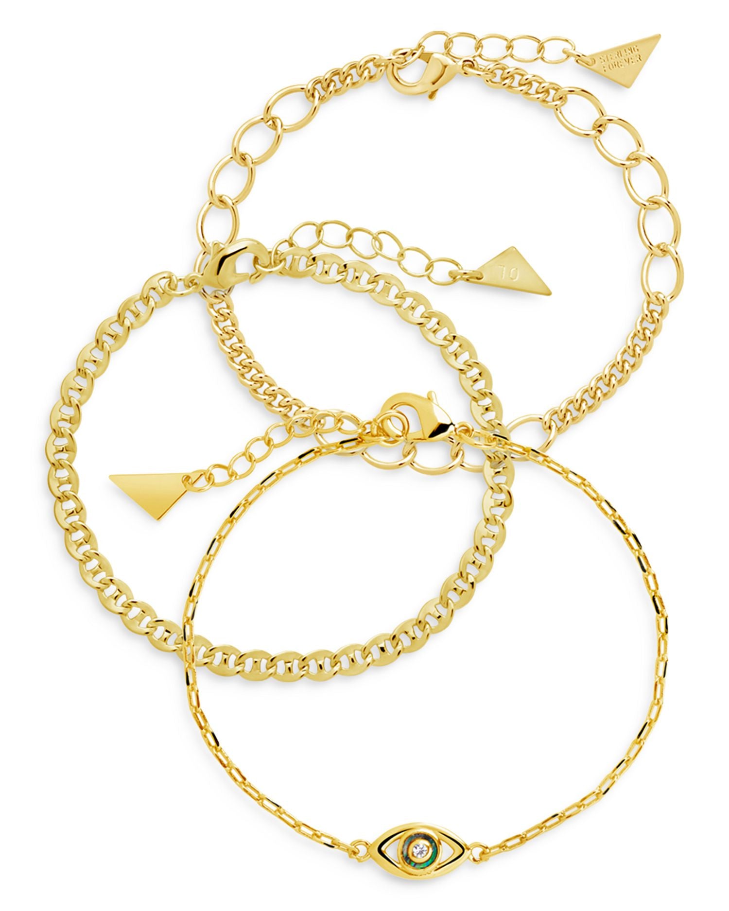 This 3 Piece Mother of Pearl & Evil Eye Chain Bracelet Set by Sterling Forever blends symbolic protection with elegant style. Featuring delicate mother-of-pearl and cubic zirconia accents, these gold-plated chain bracelets can be worn stacked for a layered look or individually for a refined, minimalist statement.