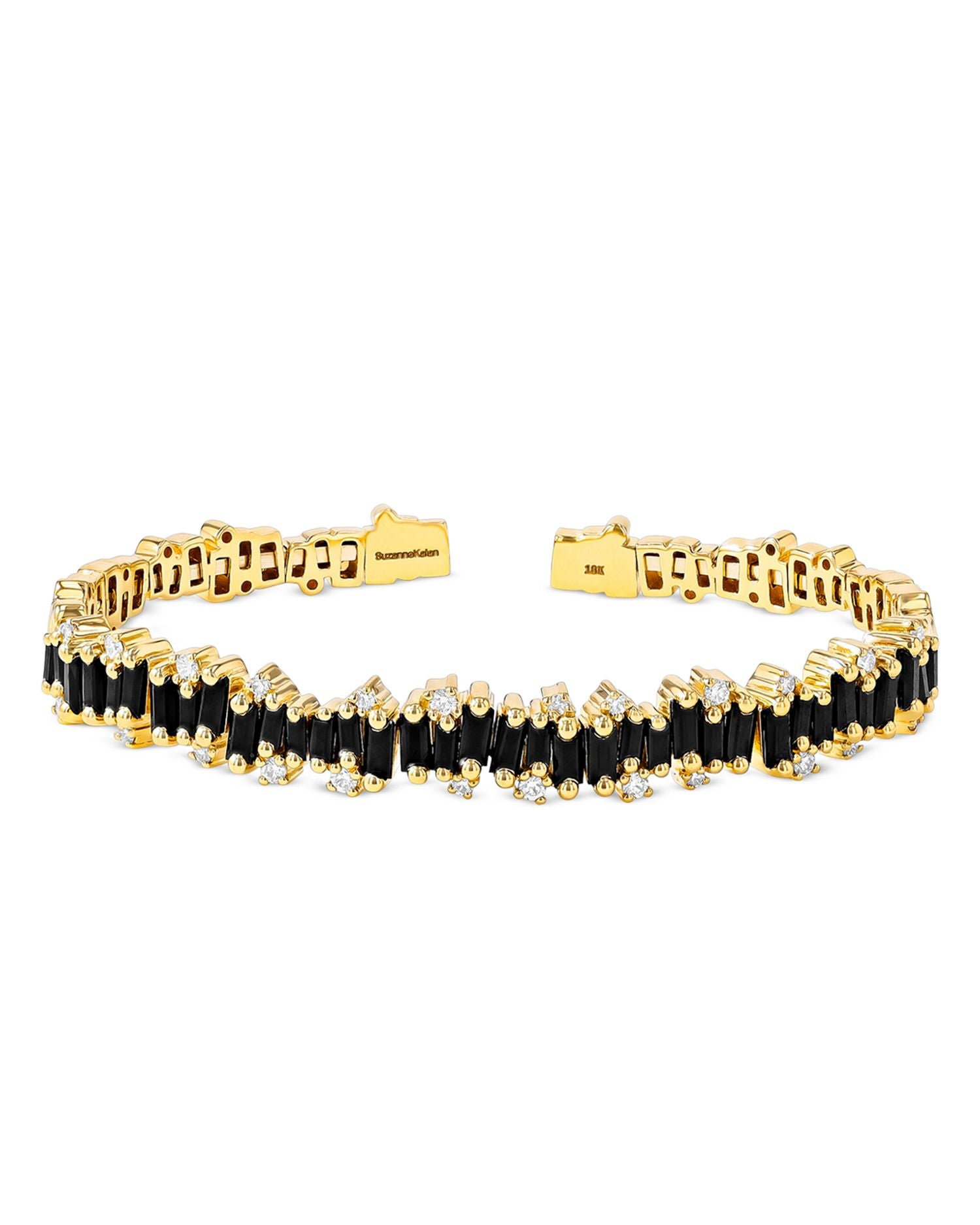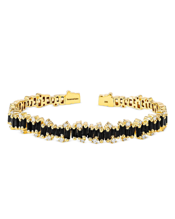 Handcrafted in 18K yellow gold with black sapphire baguettes (4 ct. t.w.) and diamonds (0.42 ct. t.w.). Size: Medium (6-6.5' wrist). Box lock clasp closure. Made in the USA.