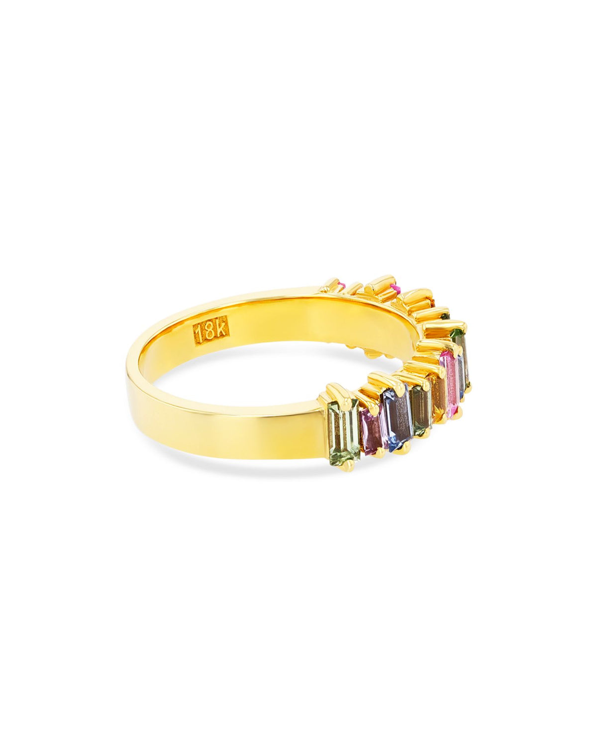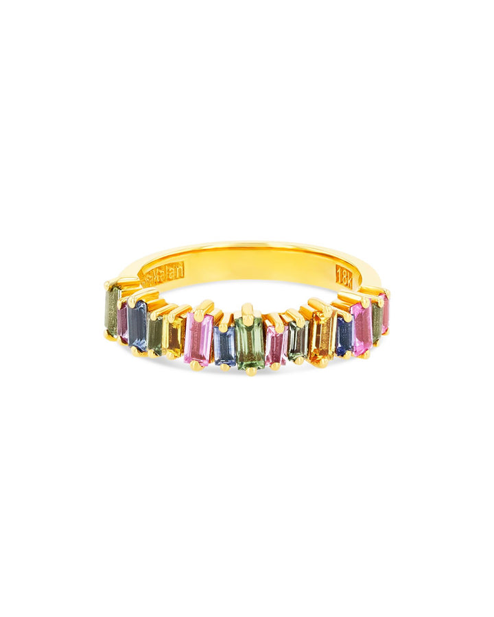 This Rainbow Sapphire Band by Suzanne Kalan is a celebration of color and craftsmanship. Designed with softly shaded rainbow sapphire baguettes set in polished yellow gold, this ring is a vibrant yet sophisticated piece, perfect for stacking or wearing solo.