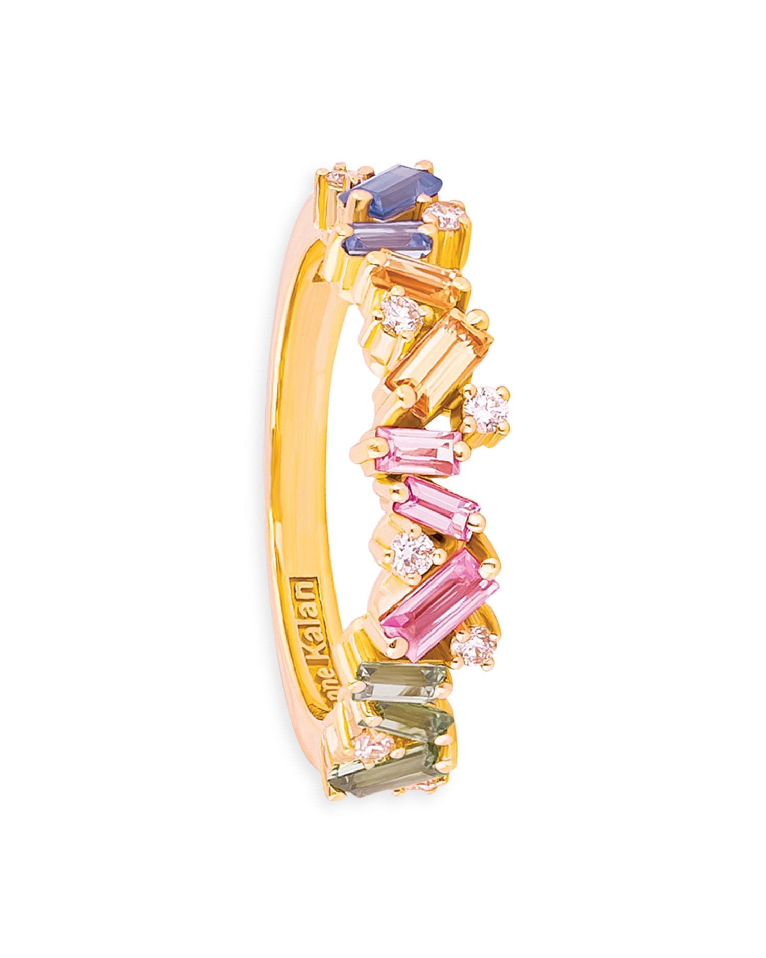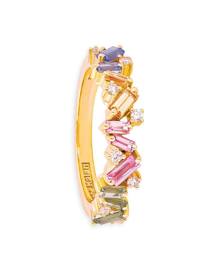 This 18K Yellow Gold Fireworks Pastel Rainbow Sapphire & Diamond Statement Ring by Suzanne Kalan from the Fireworks collection is a stunning celebration of color and brilliance. Featuring a radiant arrangement of pastel rainbow sapphire baguettes accented with sparkling diamonds, this statement ring is a style-defining piece that exudes elegance and sophistication.