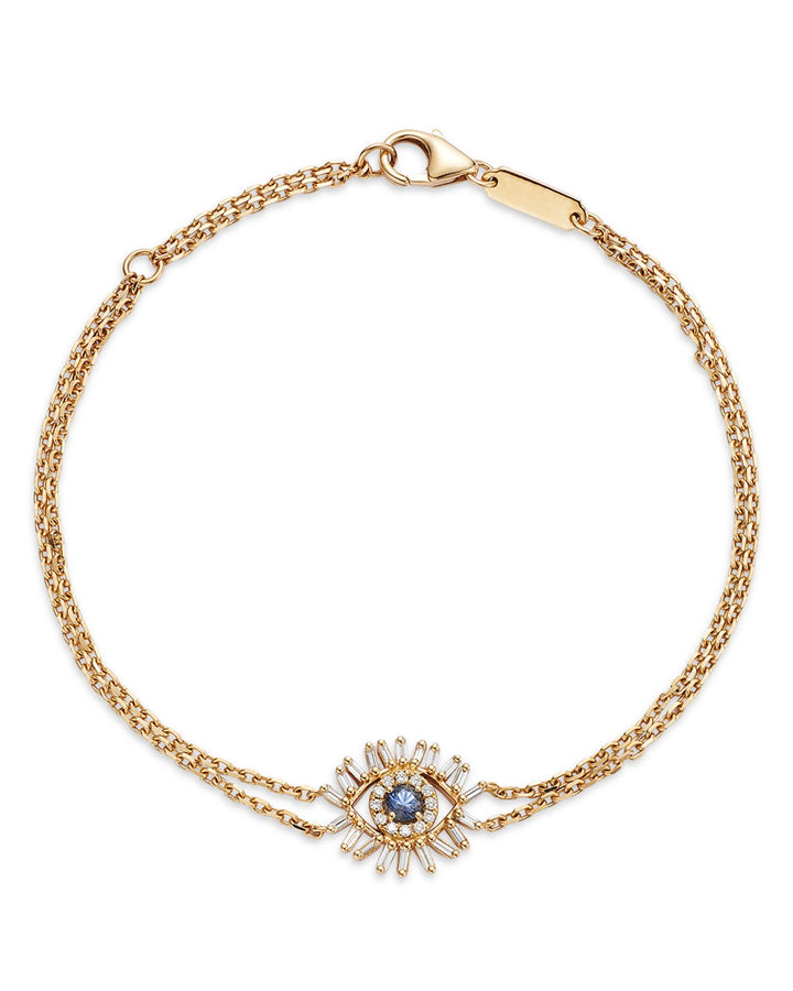 This 18K Yellow Gold Evil Eye Blue Sapphire & Diamond Double Chain Bracelet by Suzanne Kalan from the Evil Eye collection combines protection and elegance. Featuring a striking light blue sapphire surrounded by baguette and round diamonds, its layered double chain design adds a dramatic and sophisticated flair to any jewelry collection.