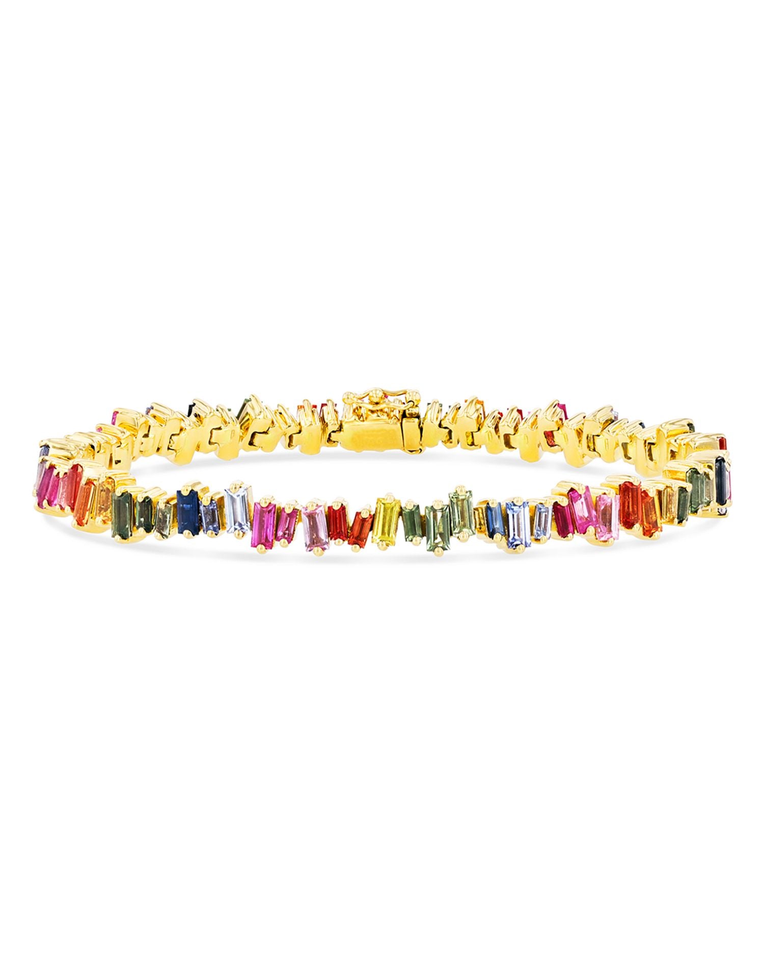 The 18K Rose Gold Fireworks Rainbow Sapphire Bracelet by Suzanne Kalan from the Fireworks collection dazzles with its kaleidoscopic beauty. This multicolor sapphire baguette bracelet features 9.38 ct. t.w. of vibrant rainbow sapphires, set in 18K rose gold. The bracelet's 7'L length and box lock clasp closure offer both elegance and security. It's a bold and colorful piece, perfect for making a statement.