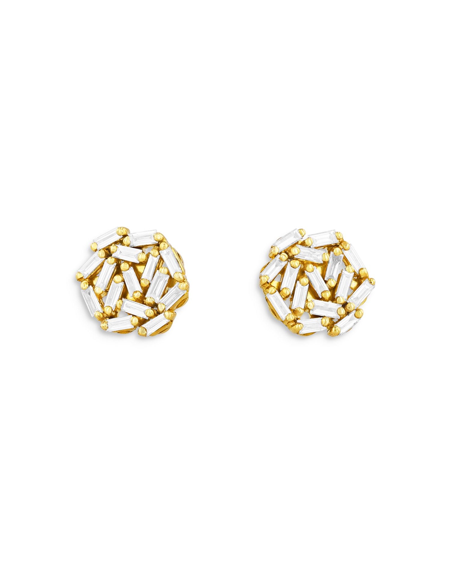 These 18K Yellow Gold Diamond Stud Earrings by Suzanne Kalan combine simplicity and brilliance. Featuring clustered baguette diamonds set in a radiant gold finish, these studs are a luxurious and versatile addition to any jewelry collection.