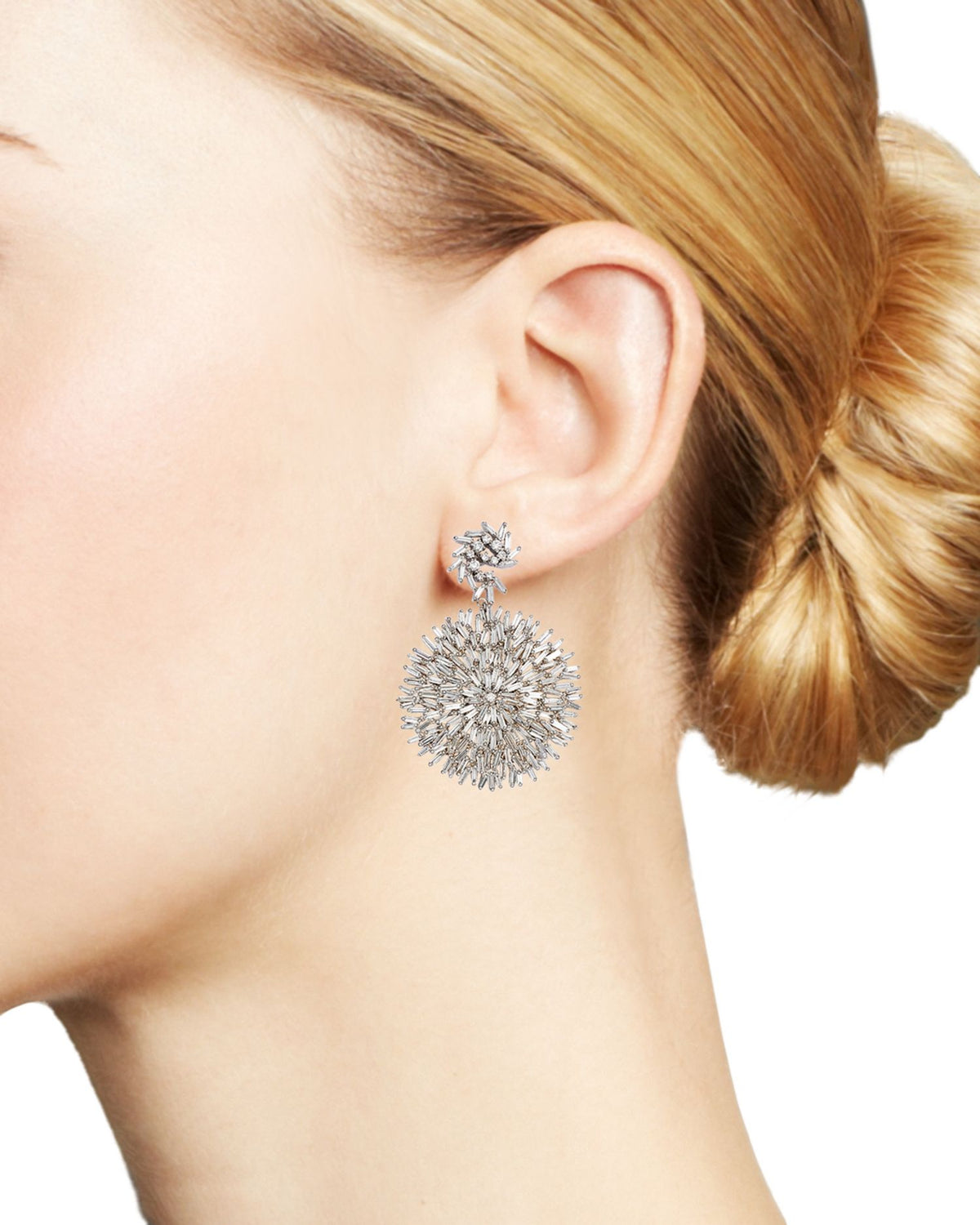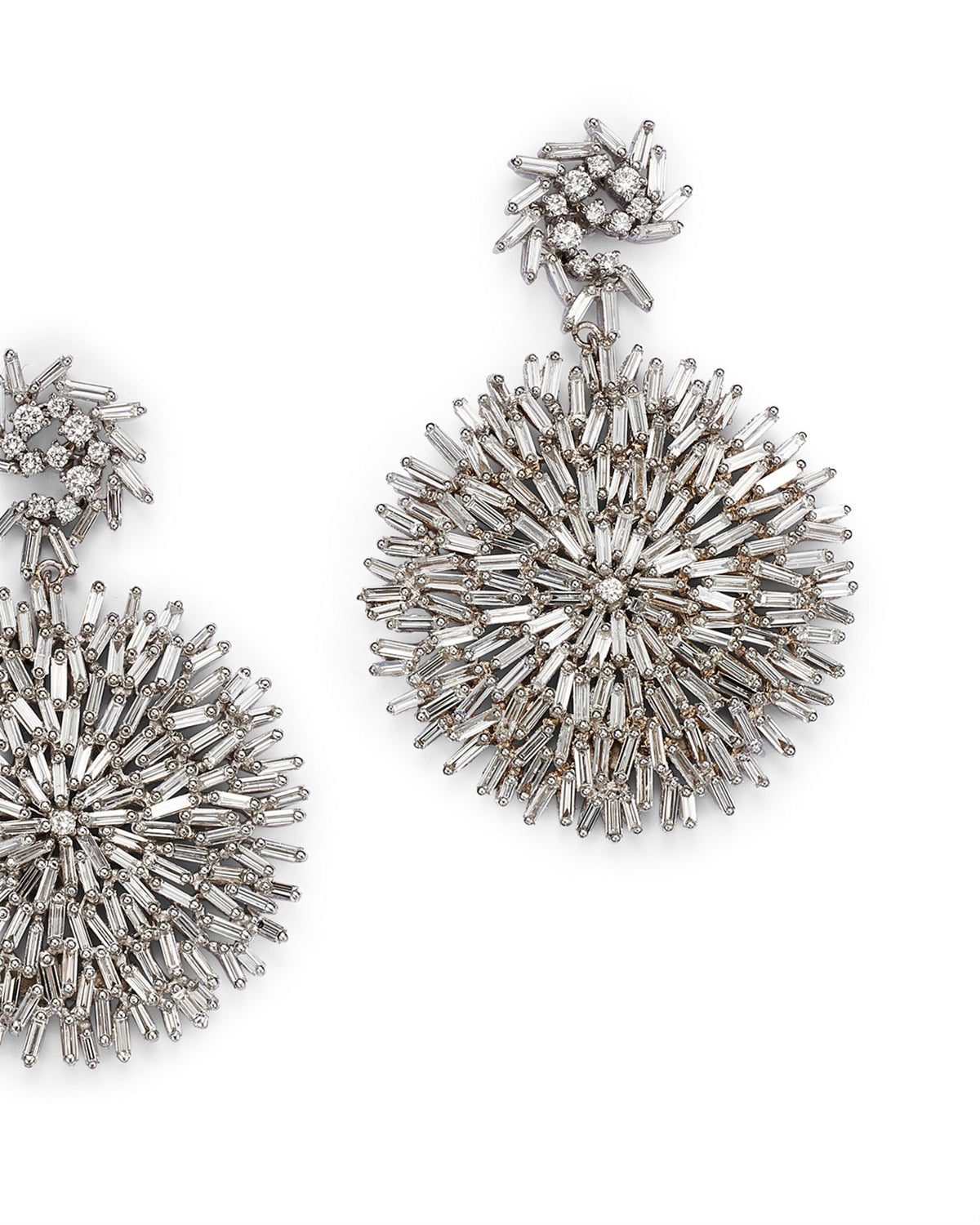 These 18K White Gold Fireworks Diamond Drop Earrings by Suzanne Kalan from the Fireworks collection are a breathtaking display of luxury. Featuring a dynamic arrangement of round and baguette diamonds, these statement earrings sparkle with every movement, offering timeless elegance for formal occasions.