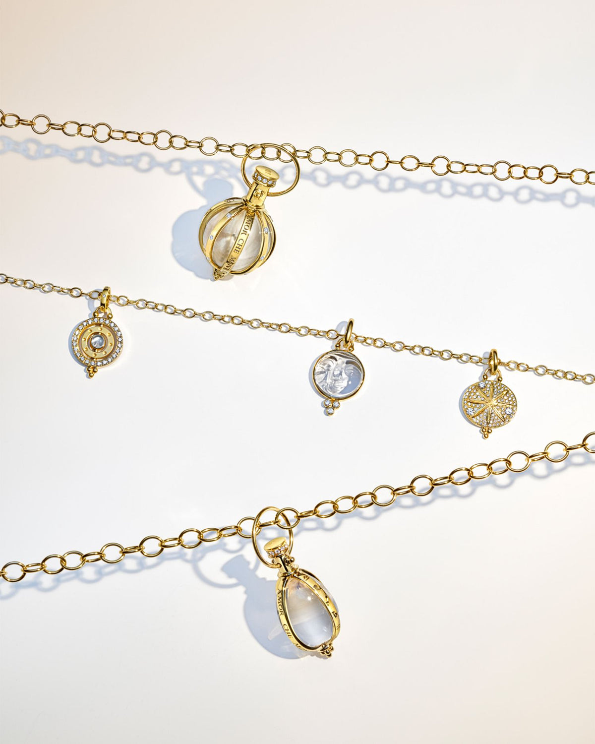 This 18K Yellow Gold Small Carved Crystal Moonface Pendant with Diamonds by Temple St. Clair combines celestial beauty with exquisite craftsmanship. The intricately carved crystal moonface is framed by sparkling diamonds, making it a poetic and enchanting piece for any jewelry lover.
