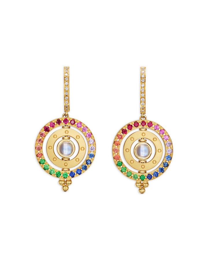 These 18K Yellow Gold FJ Multi Gemstone & Diamond Orbital Drop Earrings by Temple St. Clair from the FJ collection are a celebration of color and movement. Centered with radiant blue moonstones and accented with rainbow sapphires, rubies, tsavorite garnets, and diamonds, these earrings bring a bold yet elegant statement to any look.