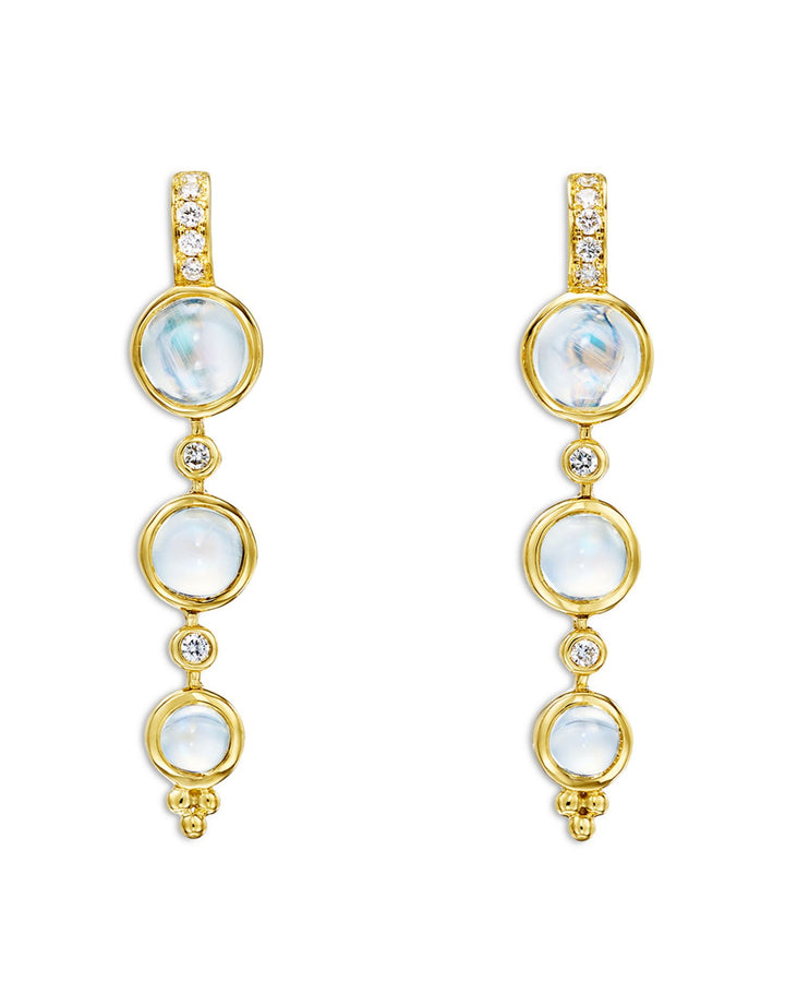 These 18K Yellow Gold Blue Moonstone & Diamond Triple Lunar Drop Earrings by Temple St. Clair offer a luminous, celestial-inspired design. Glowing blue moonstones are paired with brilliant diamonds, creating a graceful and elegant triple drop style that captivates the light.