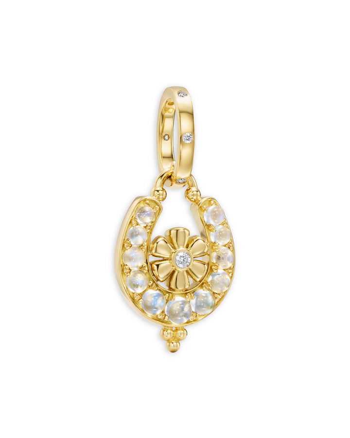 This 18K Yellow Gold FJ Blue Moonstone & Diamond Flower Horseshoe Pendant by Temple St. Clair from the FJ collection features a captivating horseshoe design. A glowing blue moonstone is accented by a center diamond flower, symbolizing luck and elegance.