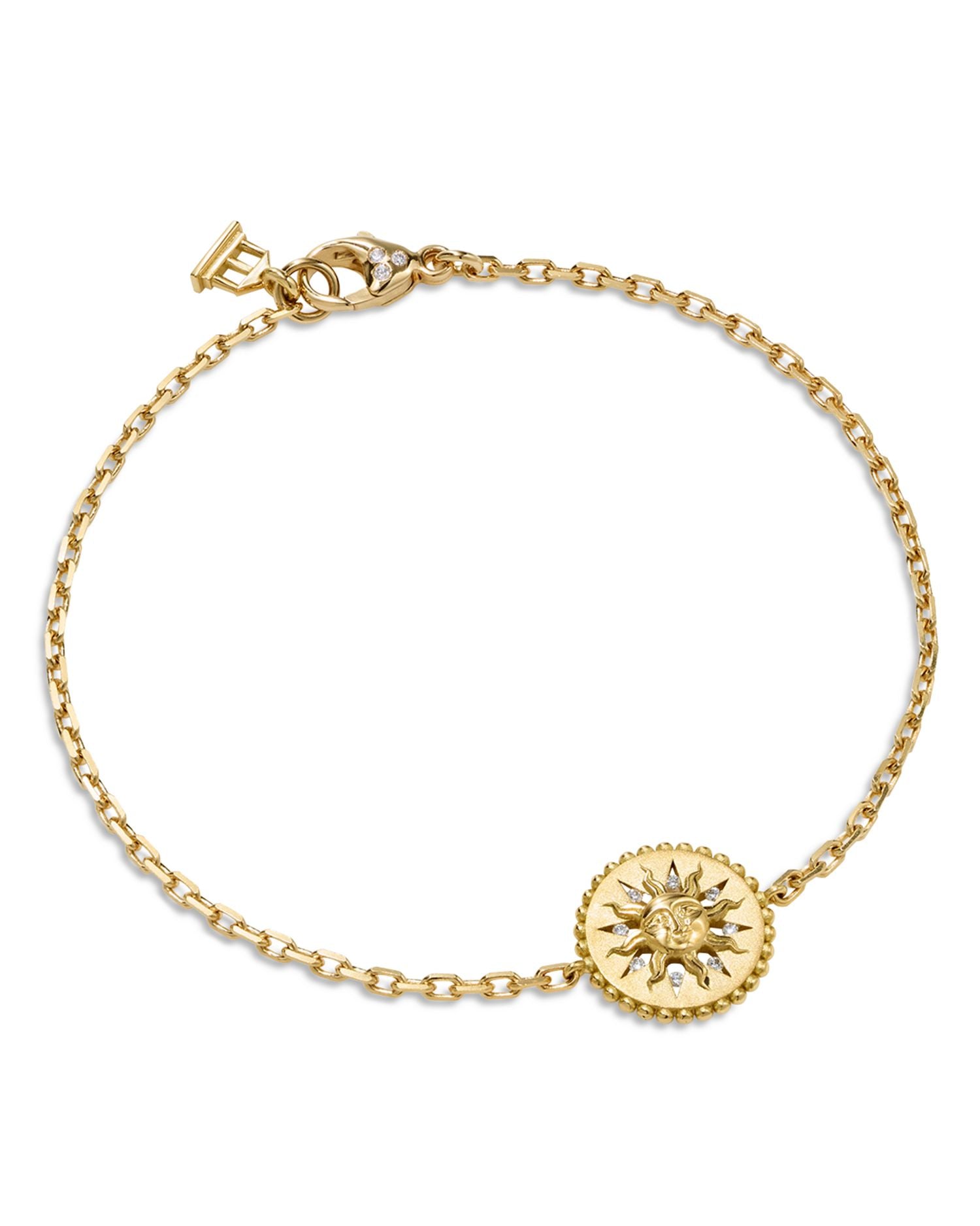 The 18K Yellow Gold & Diamond Orbit Link Bracelet by Temple St. Clair features a celestial design with finely detailed diamonds (0.12 ct. t.w.) set in 18K yellow gold. The 7.5'L bracelet offers a radiant, sophisticated touch, perfect for adding a hint of elegance to any outfit. Secured with a lobster clasp closure, this bracelet is both comfortable and luxurious.