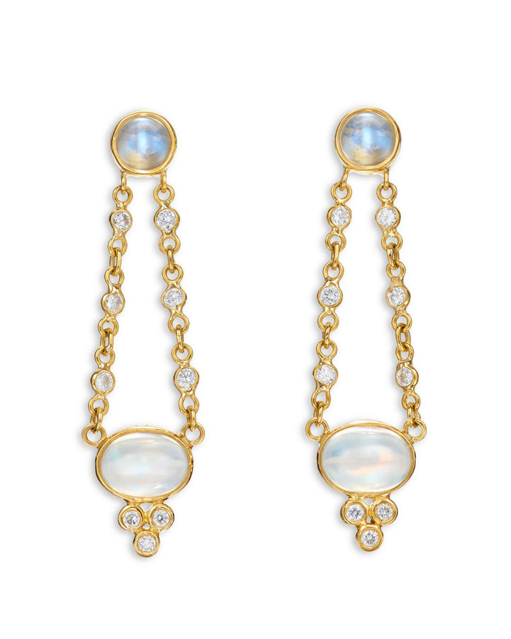 These 18K Yellow Gold Classic Moonstone & Diamond Chandelier Drop Earrings by Temple St. Clair radiate celestial elegance. Featuring glowing moonstones at the top and bottom, these dramatic chandelier drops are dotted with twinkling diamonds along suspending gold chains. The perfect statement earrings for adding movement, sophistication, and luxury to any look.