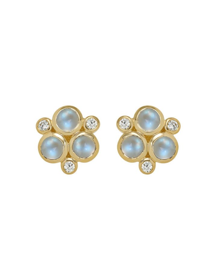 These 18K Yellow Gold Classic Trio Earrings with Royal Blue Moonstone and Diamonds by Temple St. Clair are an exquisite blend of celestial beauty and refined craftsmanship. Featuring royal blue moonstone gemstones surrounded by delicate diamond accents, these earrings bring timeless elegance to any look.