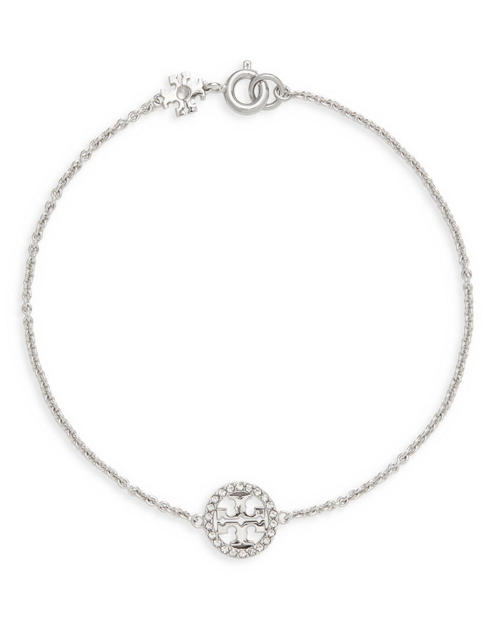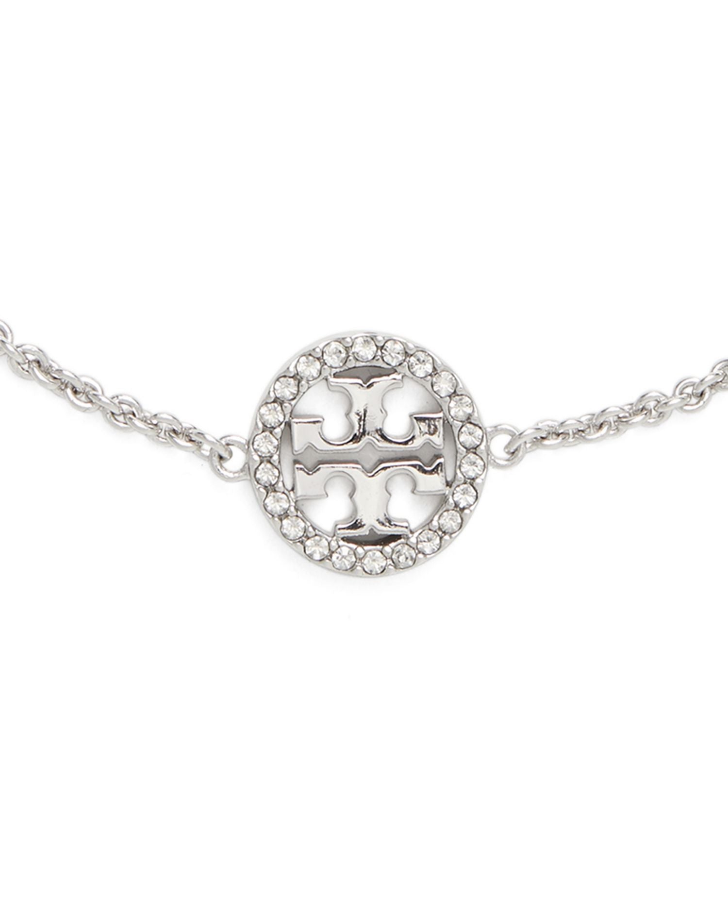 The Miller Pavé Logo Link Bracelet by Tory Burch from the Miller collection features a sleek silver-plated brass band adorned with sparkling crystals. The bracelet’s modern design, combined with the signature logo link, makes it a bold yet sophisticated piece. The 7.3'L length and spring ring closure ensure a secure fit, perfect for adding a touch of luxury to your everyday look.