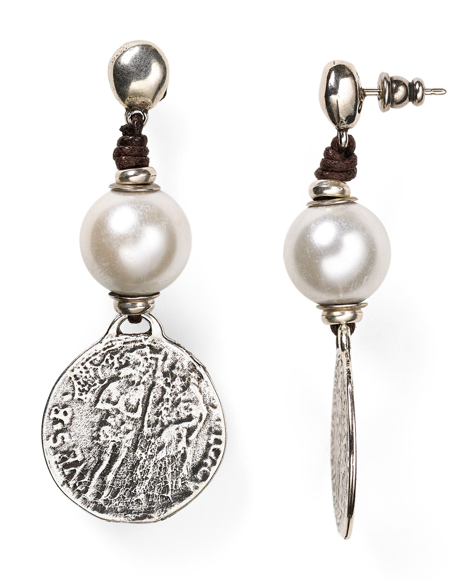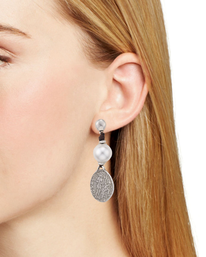 Crafted in silver-plated metal, 14mm cultured freshwater pearls, and leather. Earrings measure 2.5' drop and feature a post back closure. Nickel-free. Made in Spain.