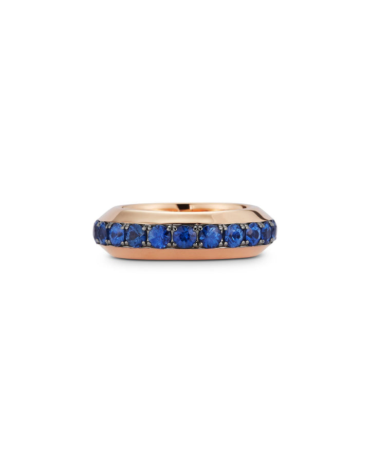 This 18K Rose Gold Grant Blue Sapphire Angled Ring, 2.56 ct. t.w. by Walters Faith brings a modern twist to classic elegance. A center row of vibrant blue sapphires enhances the angular band design, creating a bold yet refined statement piece.