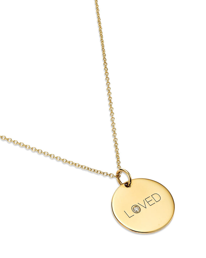 This 14K Yellow Gold Tender Tokens Diamond Love Disc Pendant Necklace, 18-20' by Zoë Chicco is a heartfelt expression of love. From the Tender Tokens collection, this necklace features a polished gold disc accented with a delicate diamond, creating a meaningful and elegant piece for any occasion.
