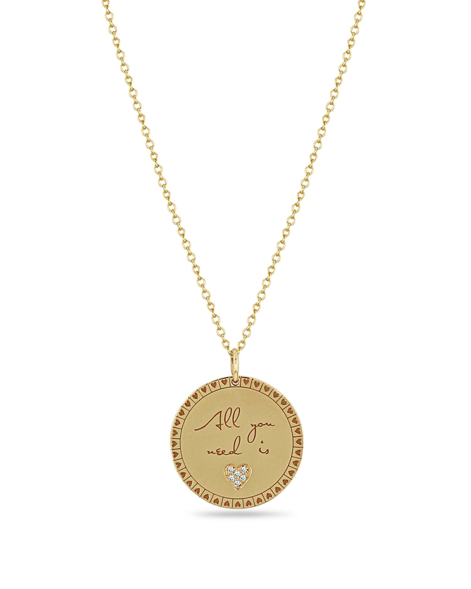 This 14K Yellow Gold Diamond 'All You Need is Love' Pendant Necklace, 16-18' by Zoë Chicco is a timeless expression of love. Featuring a diamond pavé heart on a polished message disc pendant, this necklace is both meaningful and elegant, perfect for gifting or as a personal statement piece.
