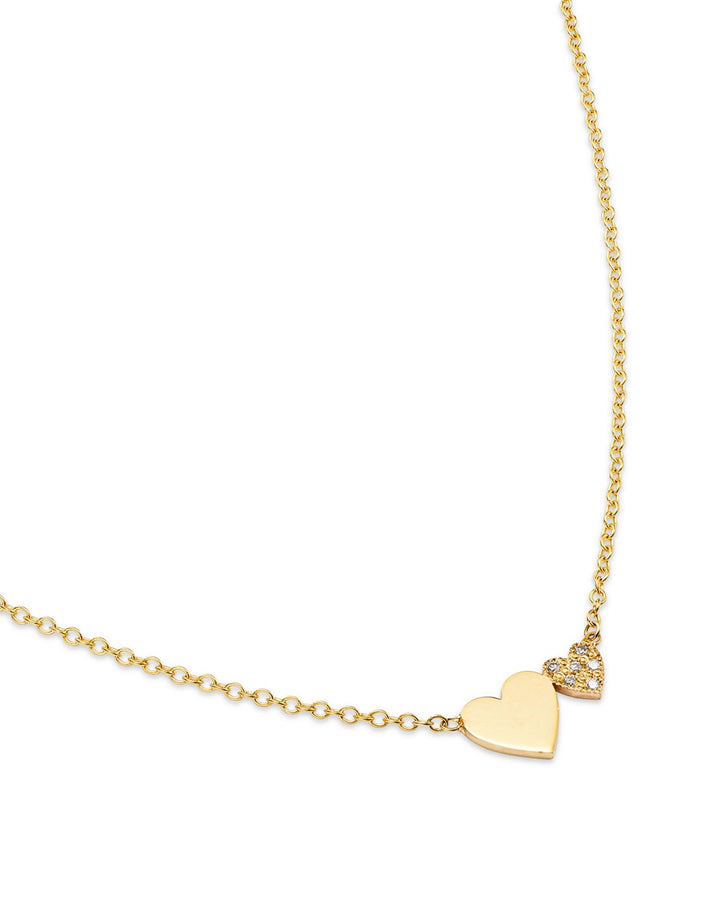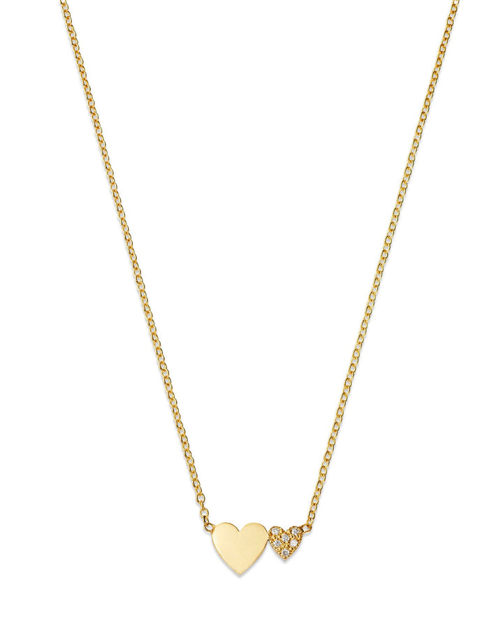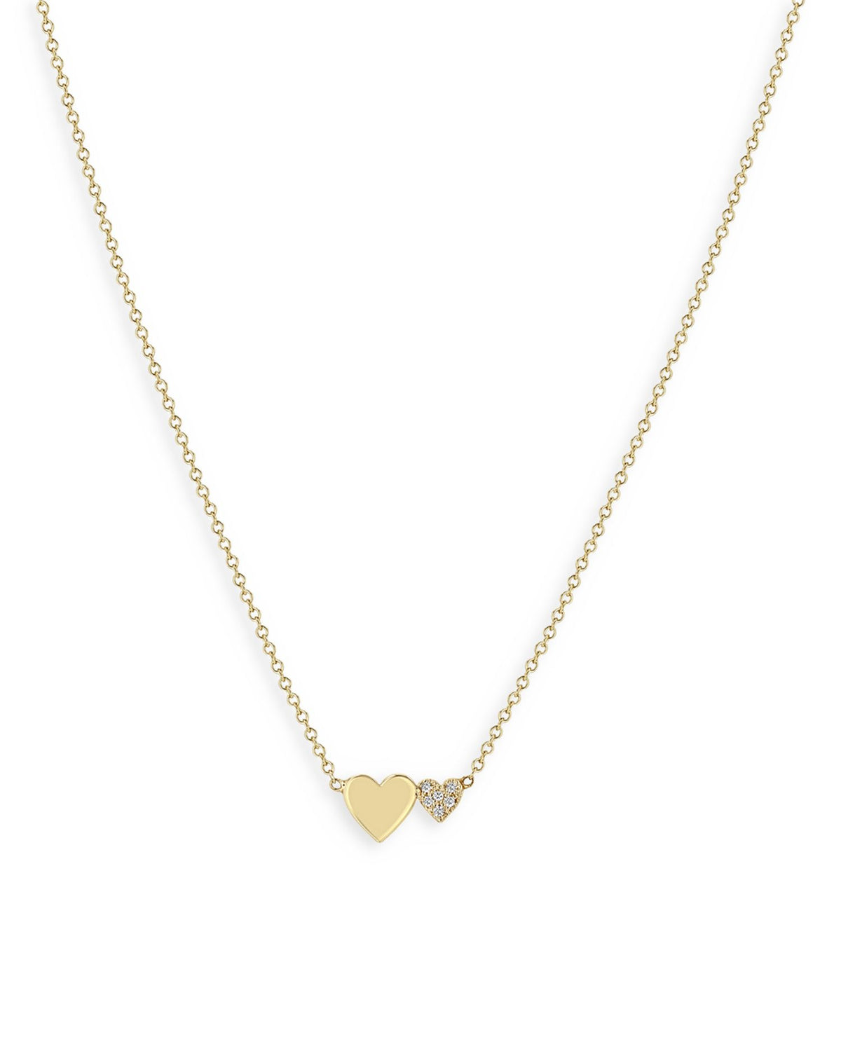 This 14K Yellow Gold Midi Bitty Symbols Diamond & Polished Double Heart Pendant Necklace, 14-16' by Zoë Chicco celebrates love with timeless elegance. From the Midi Bitty Symbols collection, this pendant features a polished heart alongside a diamond pavé heart, creating a delicate and meaningful piece.