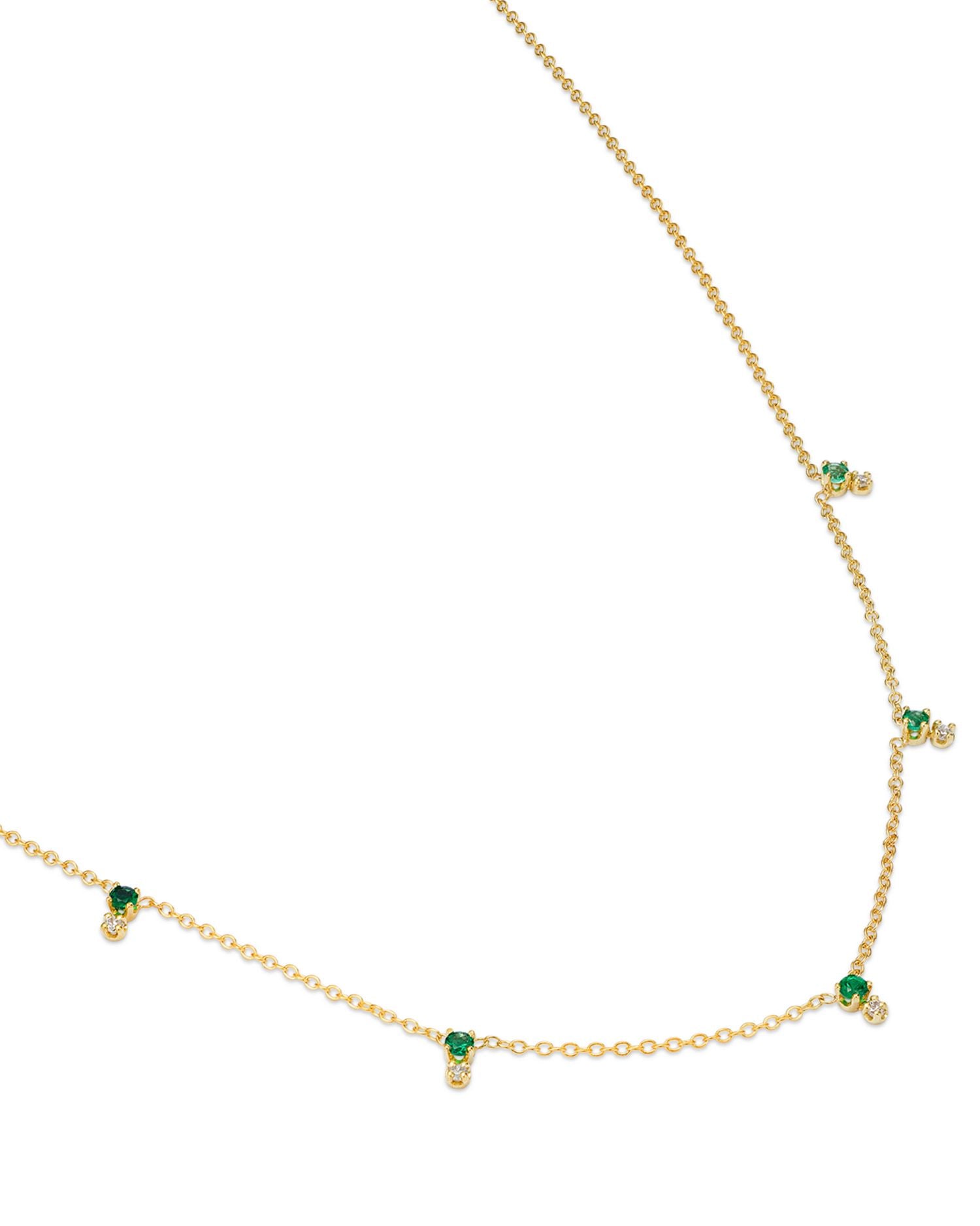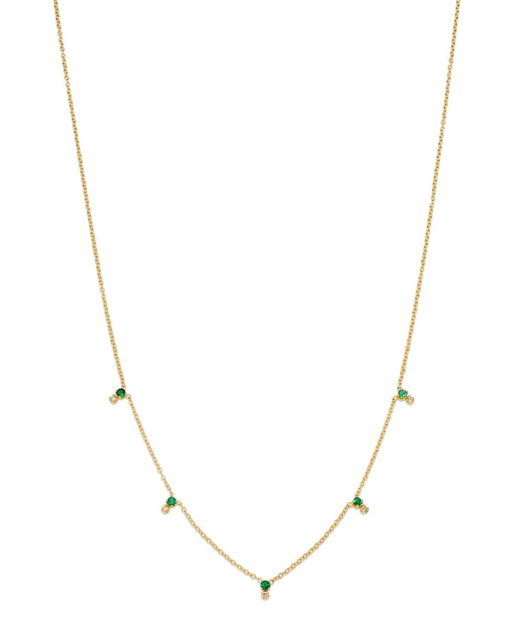 This 14K Yellow Gold Emerald Gemstones Emerald & Diamond Station Collar Necklace, 14-16' by Zoë Chicco combines grace with glamorous details. From the Emerald Gemstones collection, this short collar necklace features glowing emerald and diamond stations, creating a refined and luxurious look.