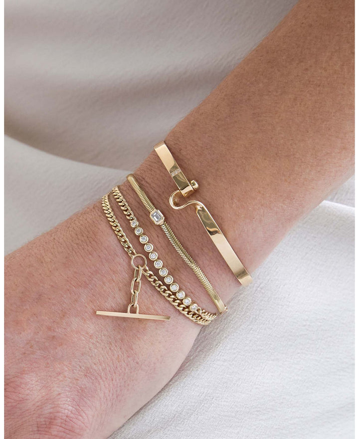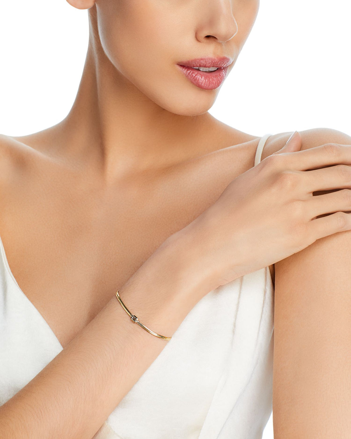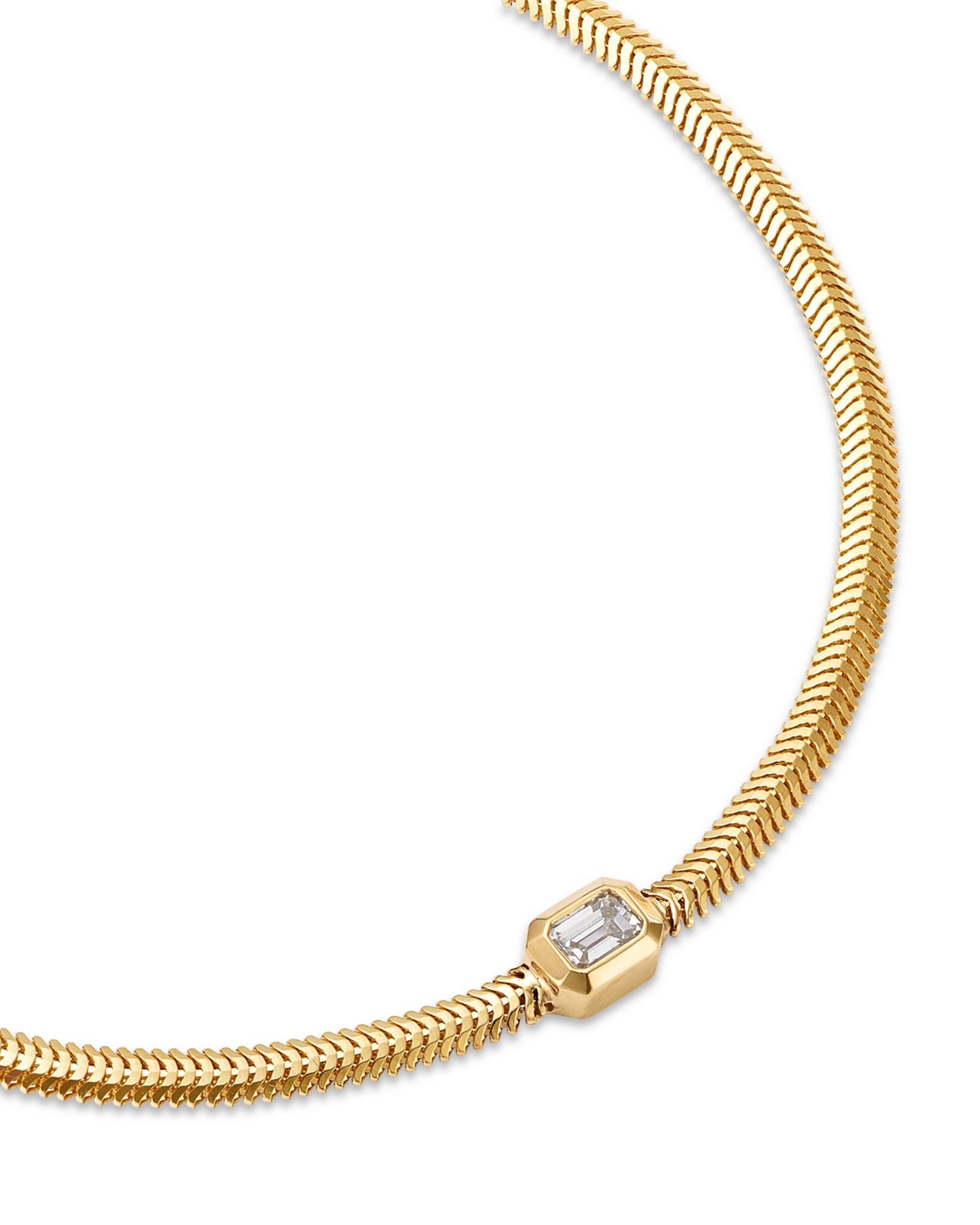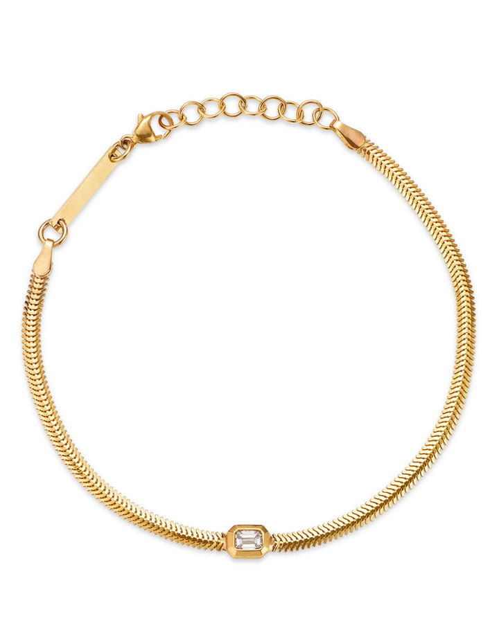 This 14K Yellow Gold Emerald Cut Diamond Snake Chain Bracelet by Zoë Chicco is a refined and luxurious design. Featuring a bezel-set emerald-cut diamond on a sleek snake chain, this bracelet offers timeless sophistication and subtle sparkle.