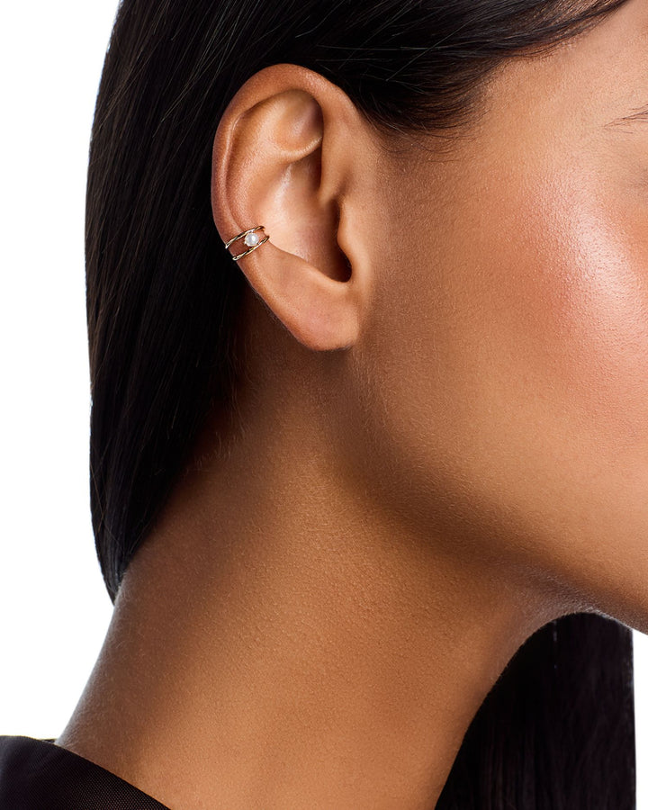 Crafted in 14K yellow gold with a white cultured freshwater pearl (2mm). Ear cuff has an inner diameter of 0.34". Made in the USA.