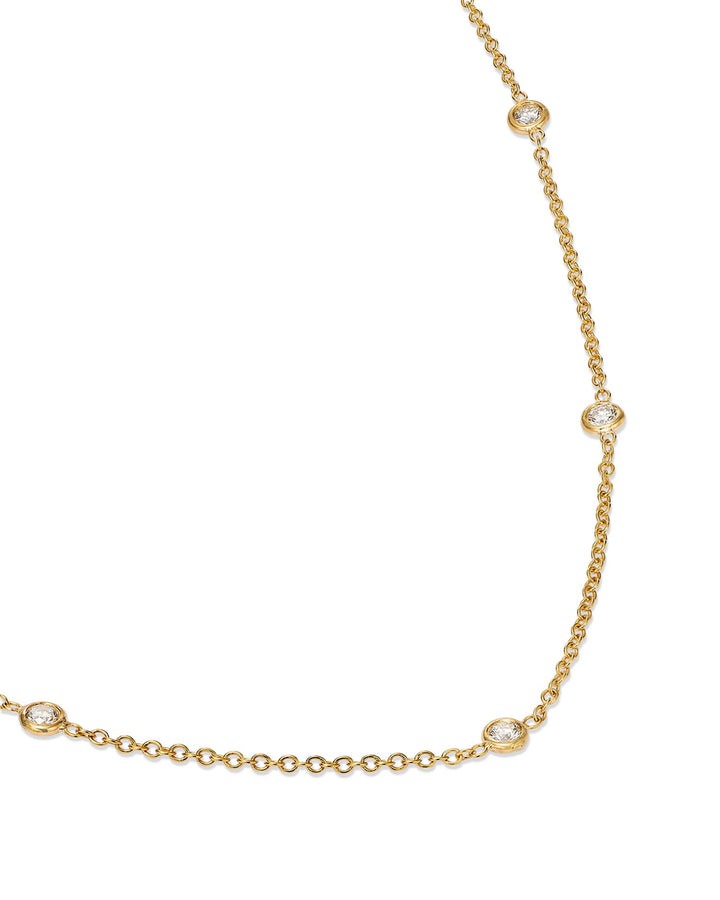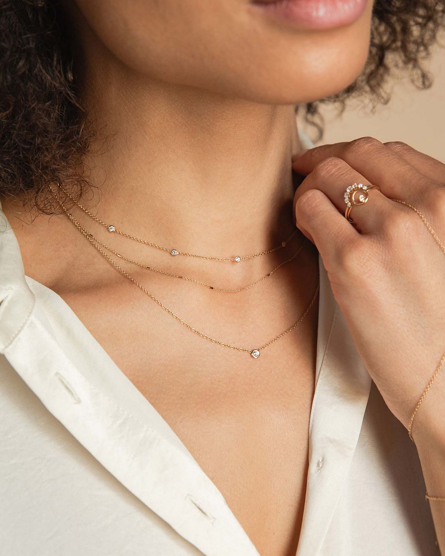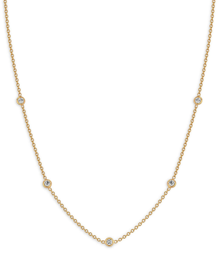 This 14K Yellow Gold Floating Diamonds Diamond Bezel Choker Necklace, 14-16" by Zoë Chicco brings understated glamour to any look. From the Floating Diamonds collection, this choker features beautifully bezel-set diamonds stationed along a delicate gold chain.