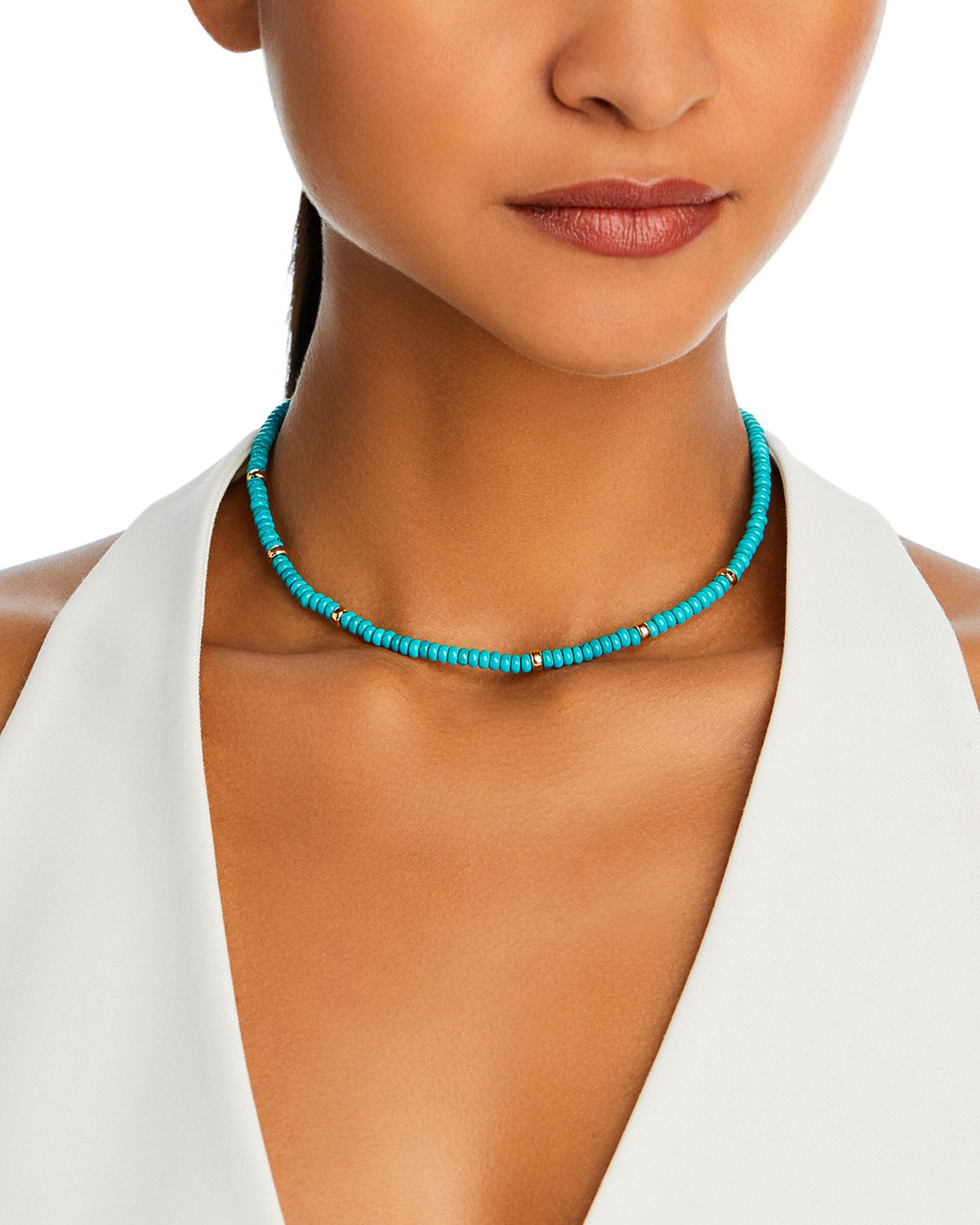 This 14K Yellow Gold Gemstone Beads Turquoise Rondelle Collar Necklace, 16-18" by Zoë Chicco brings vibrant elegance to your collection. Bright turquoise rondelles are beautifully interspersed with polished gold beads, creating a stunning, colorful statement perfect for any look.