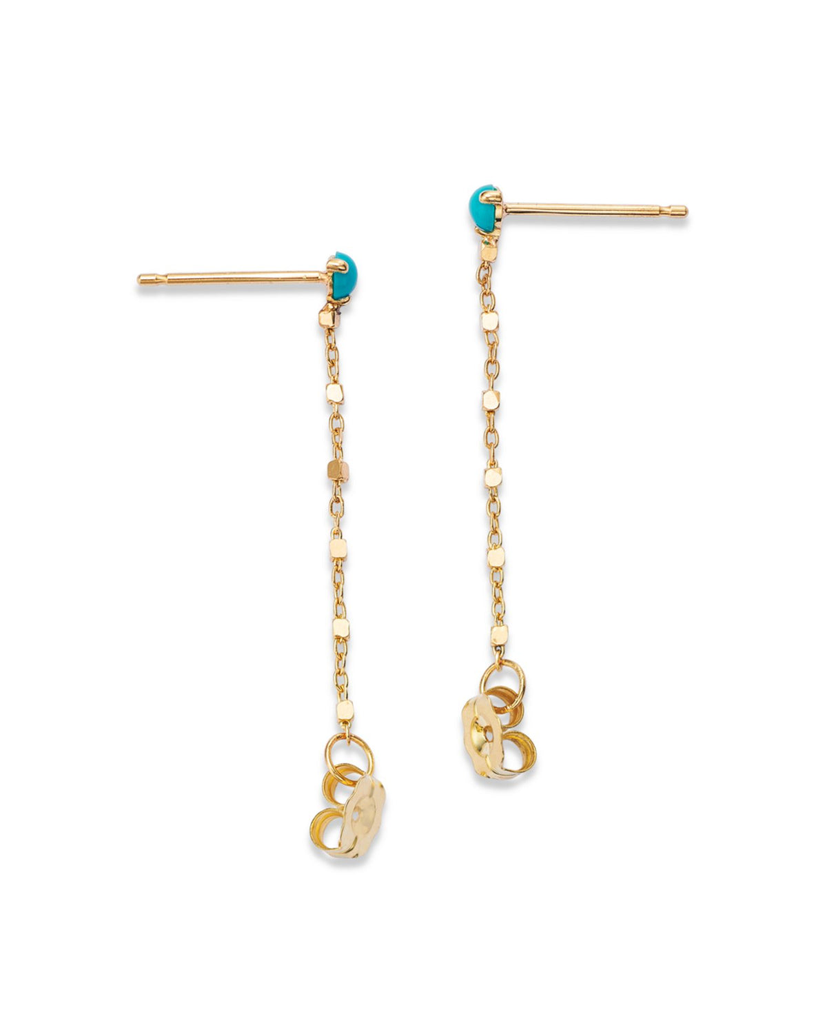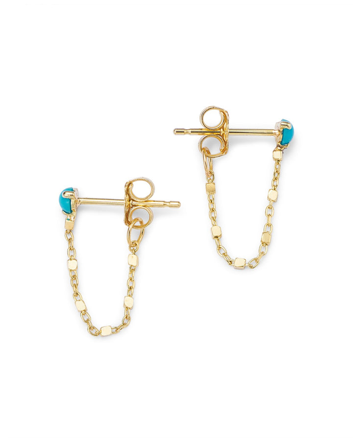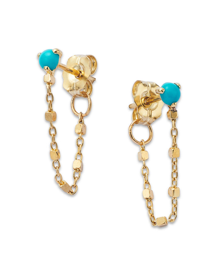 These 14K Gold Turquoise & Chain Drop Earrings by Zoë Chicco offer a delicate yet fashionable design. Featuring vibrant turquoise stones with fine gold chains that dangle elegantly, these earrings add a contemporary flair to your collection.