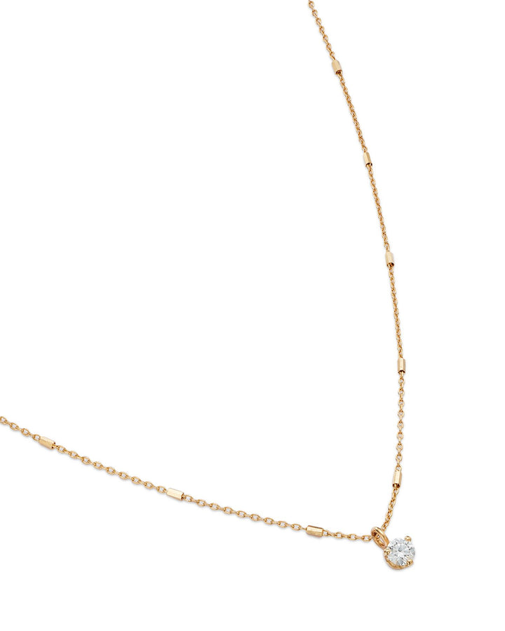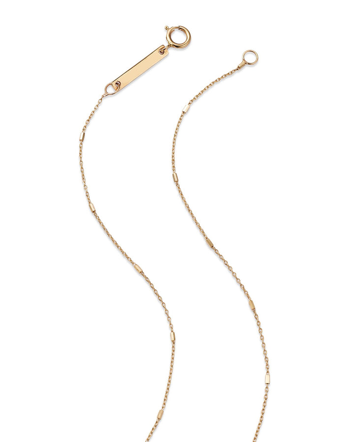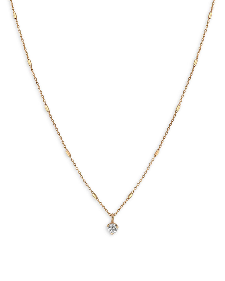This 14K Yellow Gold Prong Set Diamond Necklace, 16' by Zoë Chicco exudes minimalist elegance. A tiny prong-set diamond pendant sits delicately on a fine gold bar and cable chain, creating an effortlessly refined look.