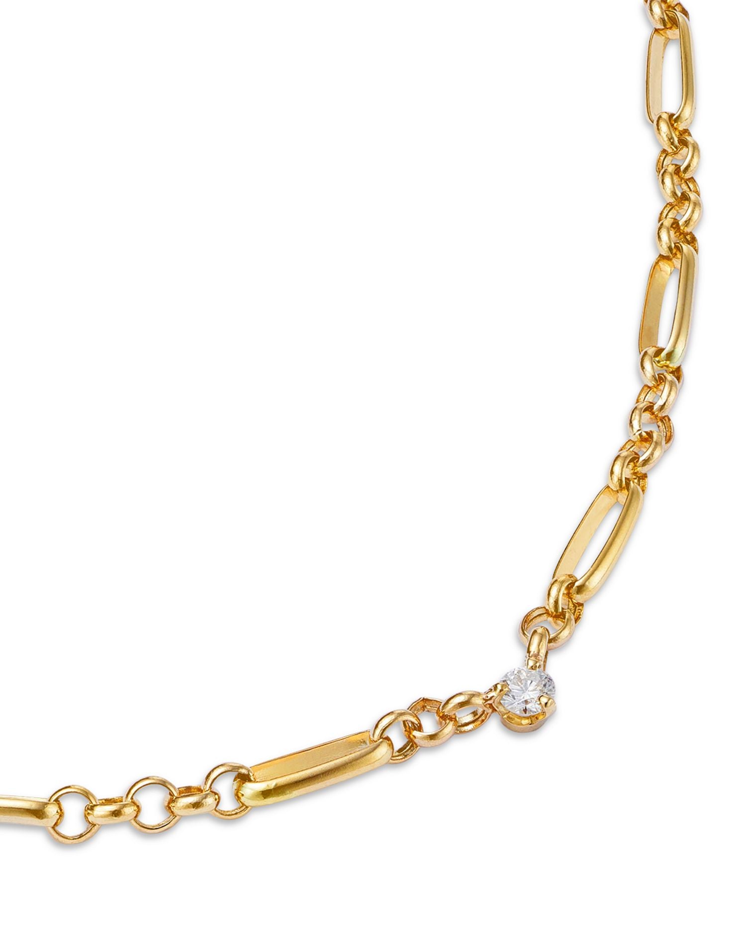 This 14K Yellow Gold Floating Diamonds Diamond Solitaire Mixed Link Pendant Necklace by Zoë Chicco, from the Floating Diamonds collection, combines elegance with modern style, featuring a rolo and paperclip mixed link chain with a solitaire diamond pendant.