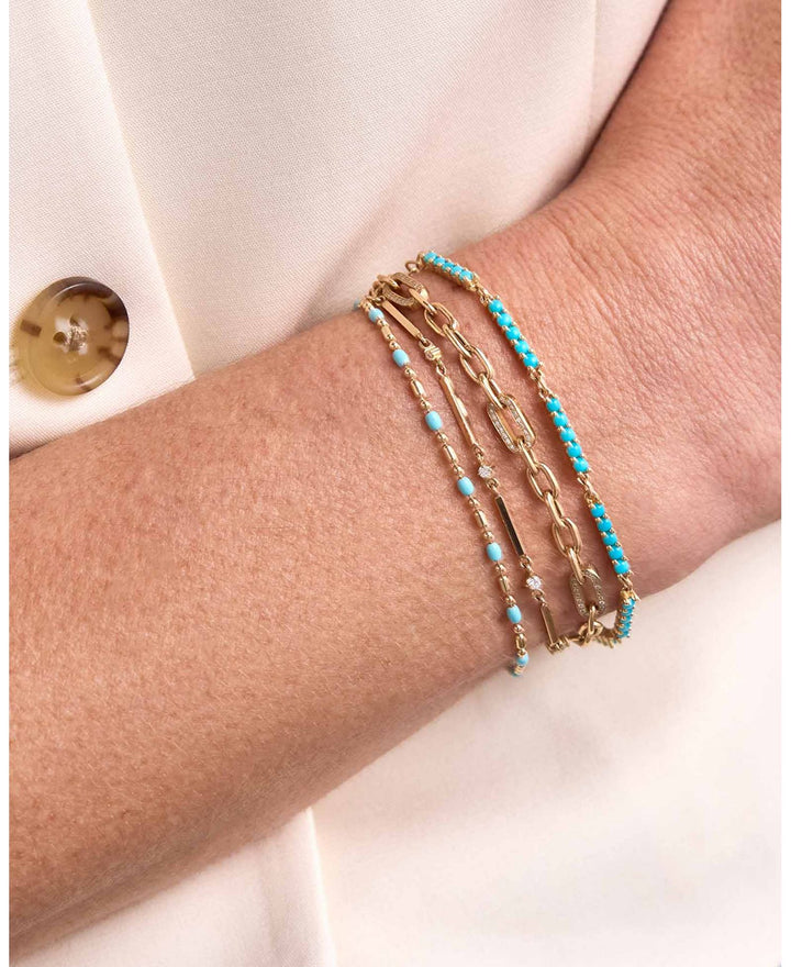 These 14K Yellow Gold Enamel Bead & Bar Link Bracelet by Zoë Chicco bring a bright, cheerful elegance to your jewelry collection. Turquoise-colored enamel beads punctuate a polished bar link design, creating a playful yet refined piece perfect for everyday wear or layering with other bracelets. From the Enamel Collection, this bracelet reflects Zoë Chicco’s signature blend of sophistication and subtle charm.