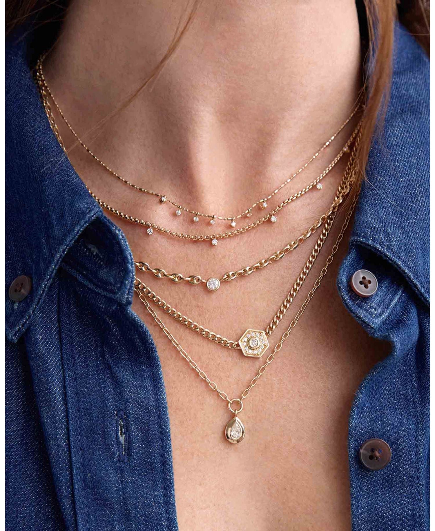 This 14K Yellow Gold Paris Diamond Hexagon Collar Necklace by Zoë Chicco from the Paris Collection features a larger diamond surrounded by pavé diamonds set in a striking hexagon shape. The collar design adds an elegant and modern touch to this piece, making it an ideal statement necklace for any occasion.