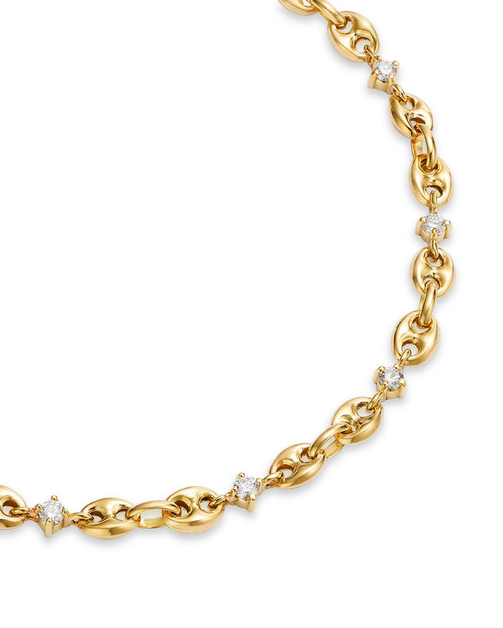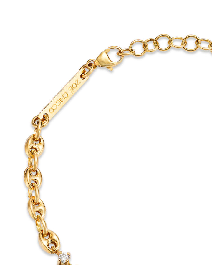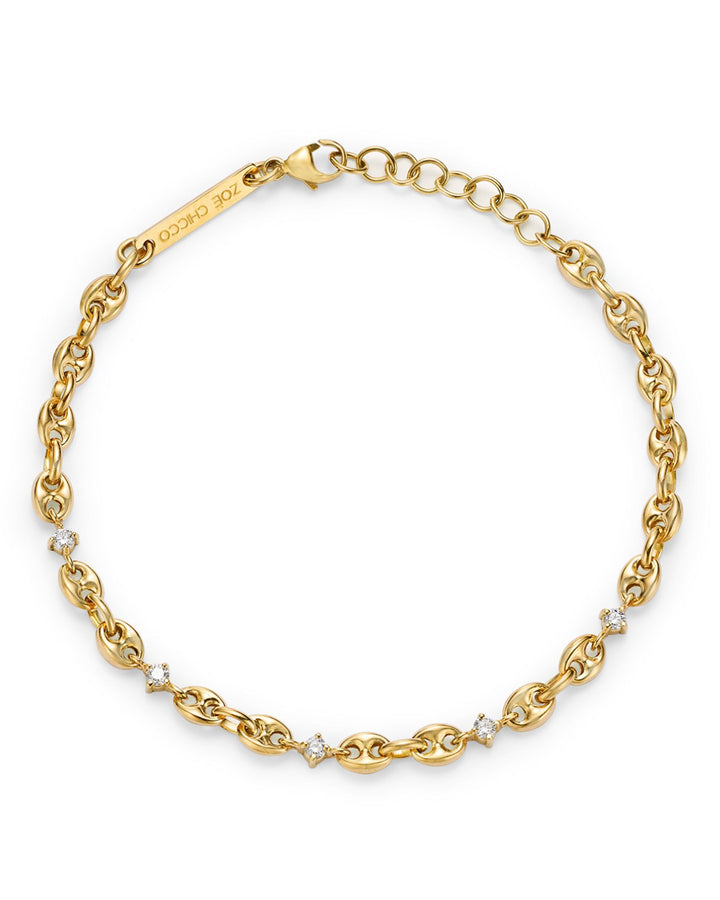 The 14K Yellow Gold Prong Diamonds Diamond Mariner Link Bracelet by Zoë Chicco from the Prong Diamonds collection features a puffed mariner link chain interspersed with sparkling diamonds (0.15 ct. t.w.; color/clarity: FG/SI1SI2). The 6-7'L length and lobster clasp closure ensure a secure fit, making it a sophisticated and luxurious bracelet ideal for both casual and formal occasions.