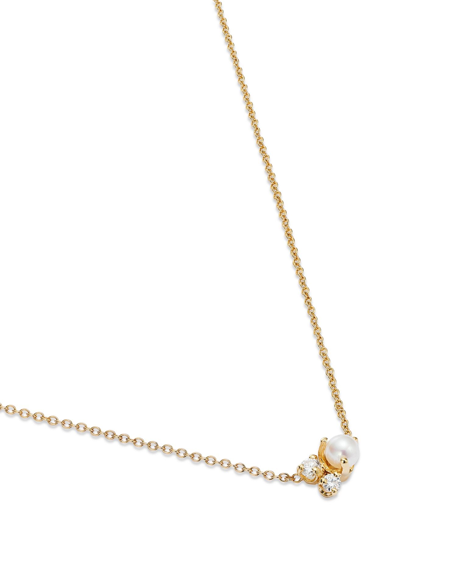 Handcrafted in 14K yellow gold with diamonds totaling 0.08 ct. t.w. (color/clarity: FG/SI2) and a 4mm cultured pearl. Adjustable chain length: 14-16 inches; Pendant length: 0.23 inches. Secured with a spring ring clasp closure. All gemstone carat weights (ct. t.w.) are approximate with a variance of 0.05 carat. Made in the USA.