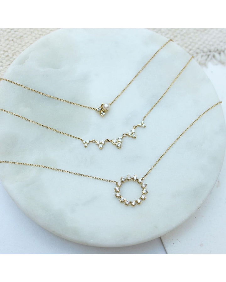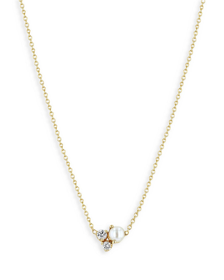 This 14K Yellow Gold Mixed Prong Diamond & Cultured Pearl Cluster Necklace by Zoë Chicco combines prong-set diamonds of mixed sizes with a single 4mm cultured pearl for a striking contrast. Set on a 14K gold cable chain, this necklace offers a blend of luxury and organic beauty, perfect for layering or wearing on its own.