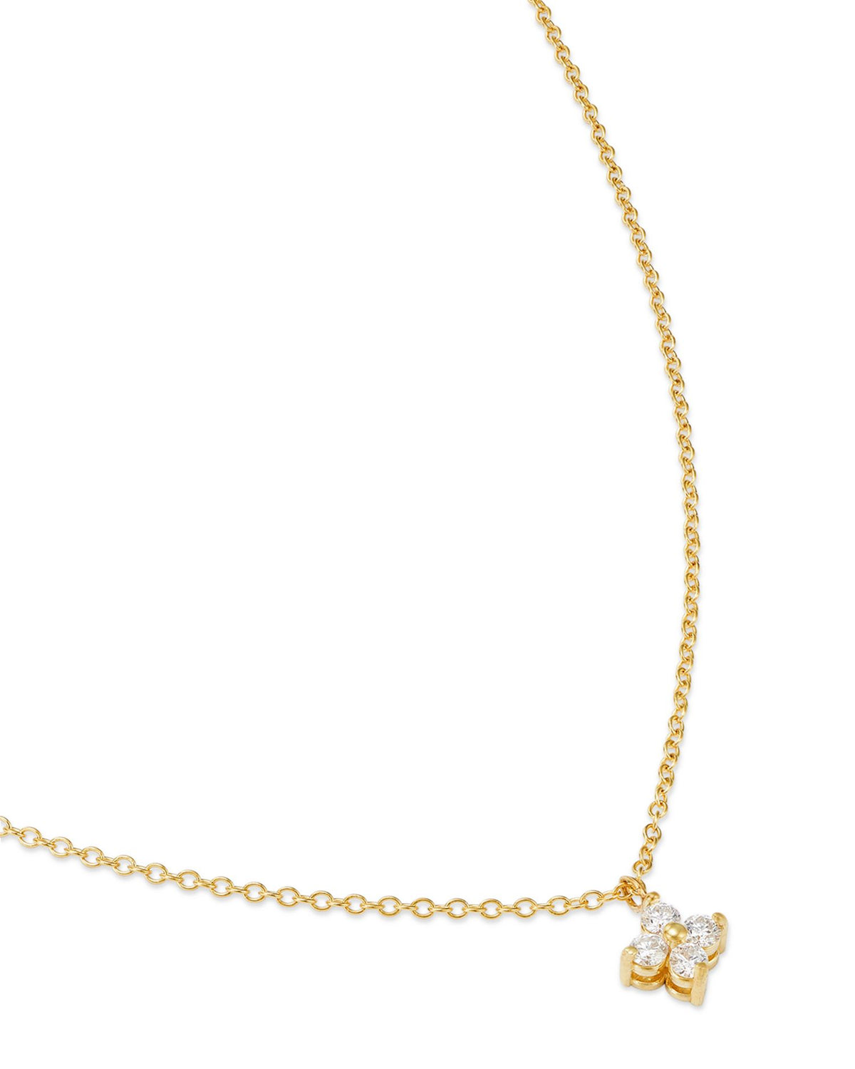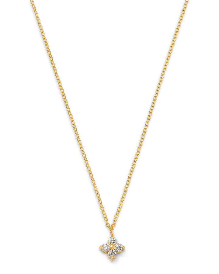 This 14K Yellow Gold Prong Diamonds Diamond Flower Pendant Necklace by Zoë Chicco from the Prong Diamonds Collection features a delicate diamond flower that floats along a gold chain. The design offers a feminine and elegant touch, making it an ideal piece for everyday wear or special occasions.