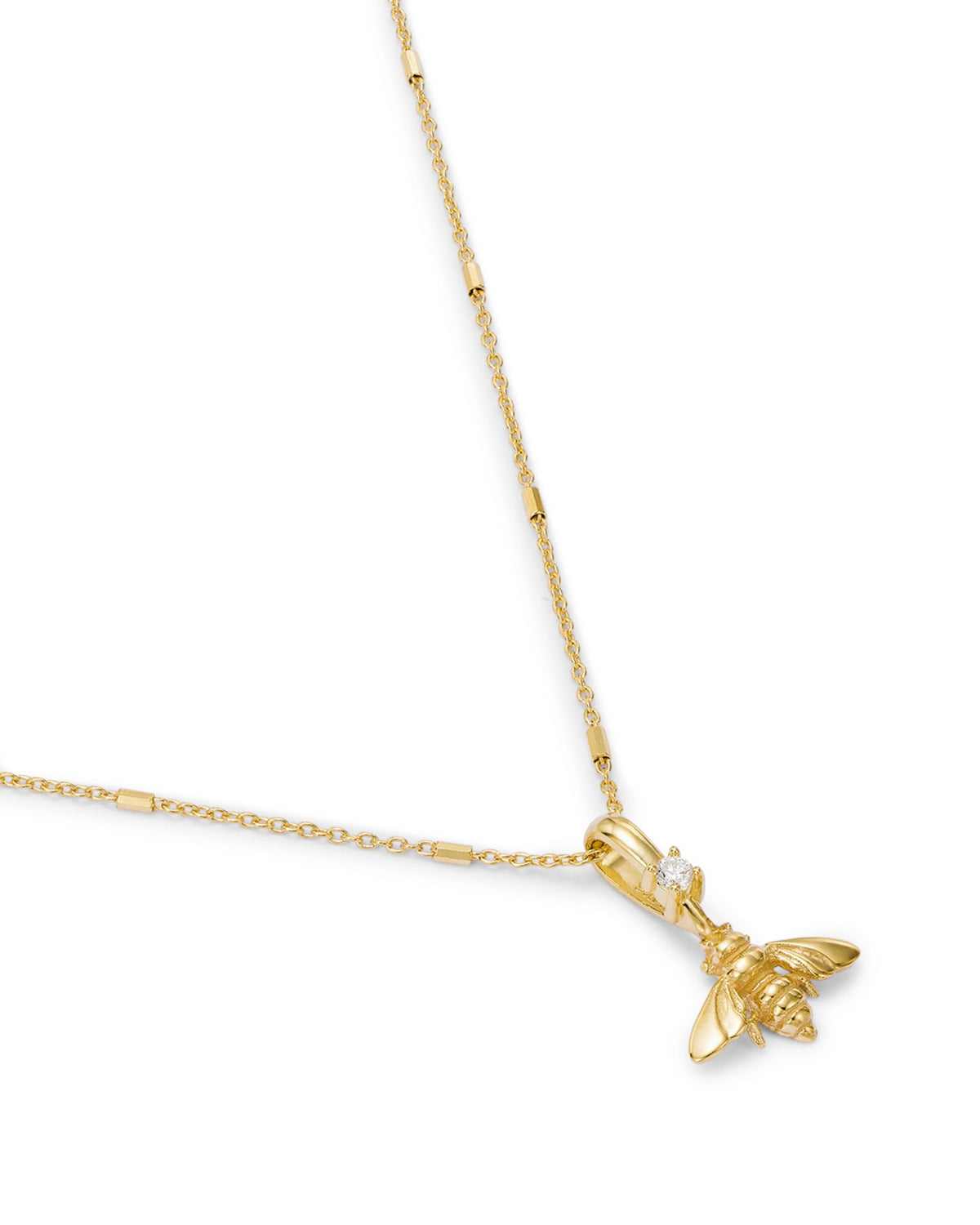 This 14K Yellow Gold Bee & Diamond Pendant Necklace by Zoë Chicco from the Kingdom Collection features a charming bee pendant adorned with a small diamond. The delicate bar and cable chain necklace adds a whimsical touch to the piece, making it perfect for everyday wear.