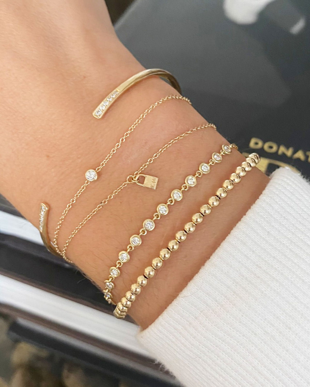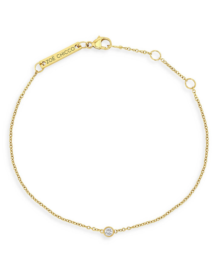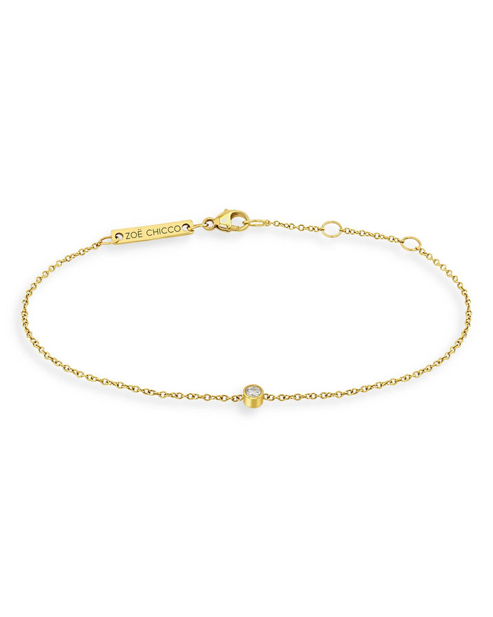 This 14K Yellow Gold Chain Bracelet with Bezel-Set Diamond by Zoë Chicco features a delicate chain with a bezel-set diamond that adds a touch of sparkle. The bracelet’s adjustable length makes it easy to wear alone or stack with other pieces for a personalized look.