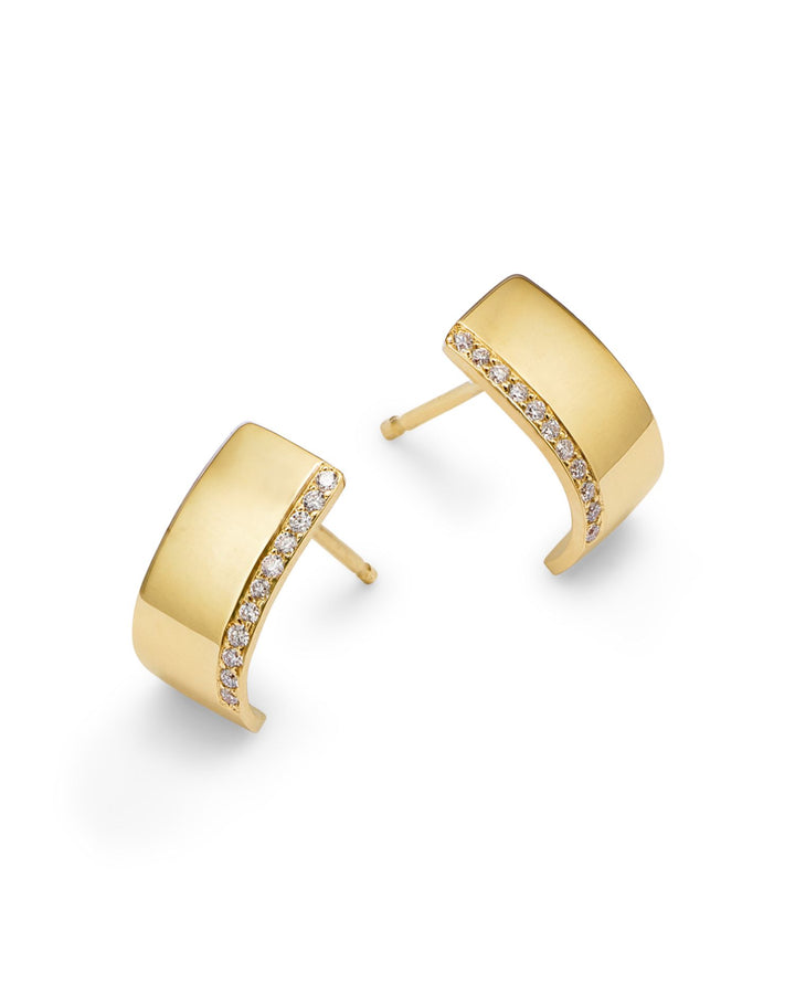 Handcrafted in 14K yellow gold with diamonds totaling 0.10 ct. t.w. (color/clarity: F-G/SI1-SI2). Length: 0.45 inches. Secured with post-back closure. All gemstone carat weights (ct. t.w.) are approximate with a variance of 0.05 carat. Made in the USA.