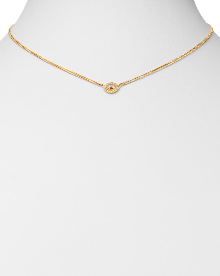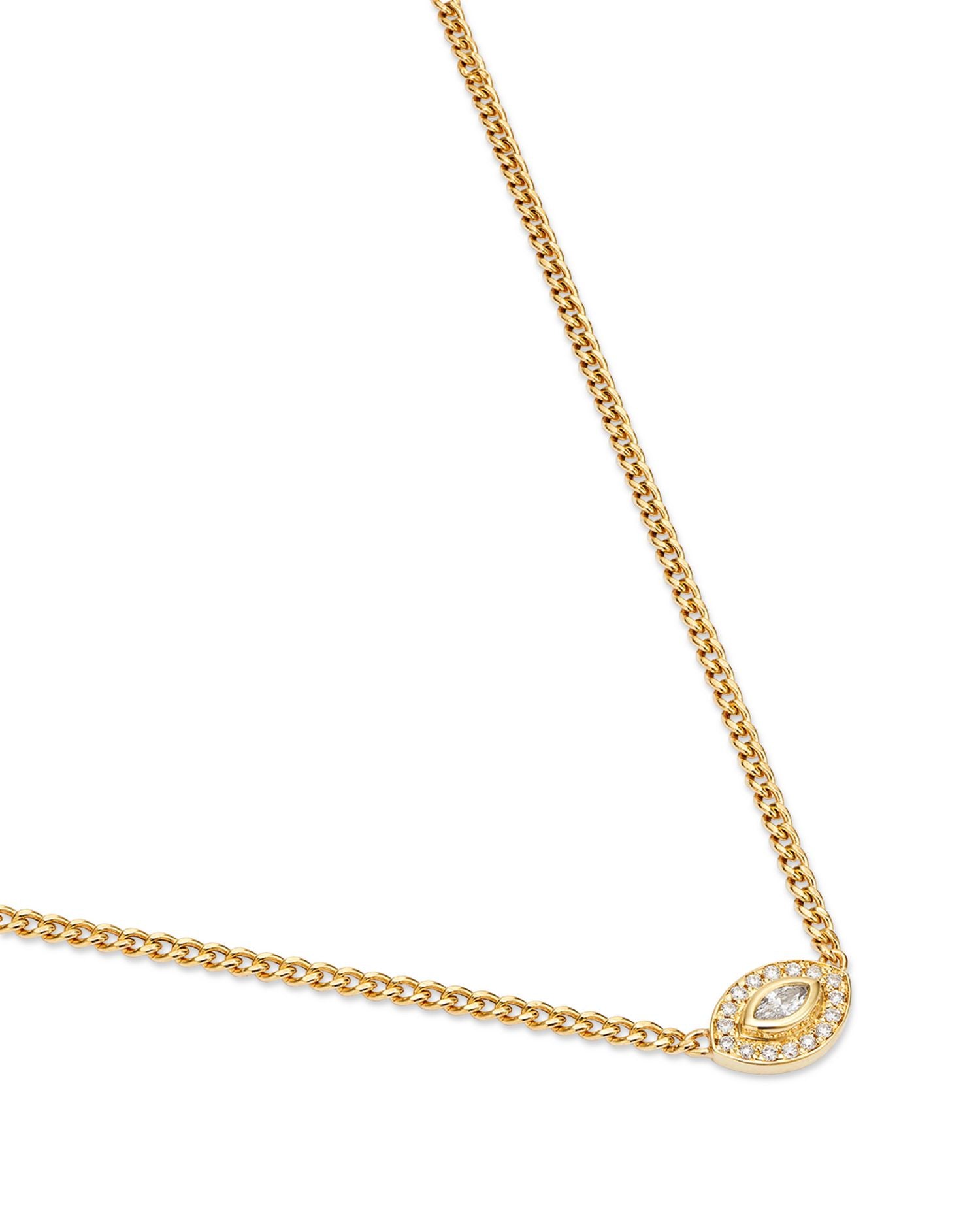 This 14K Yellow Gold Diamond Eye Pendant Necklace by Zoë Chicco features a halo design with a marquis-set diamond eye pendant. The eye-catching pendant provides a touch of mystery and elegance, making it perfect for adding an extra layer of sophistication to any outfit.