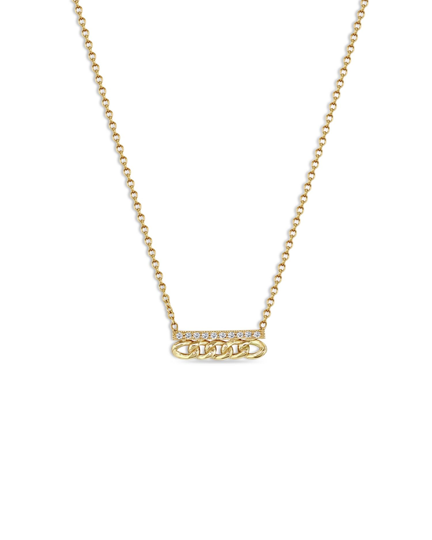 This 14K Yellow Gold Diamond Curb Link Pendant Necklace by Zoë Chicco features diamond pavé that illuminates the unique detailing of the curb link pendant. A sophisticated design that offers a subtle sparkle, making it an ideal accessory for both day and night.