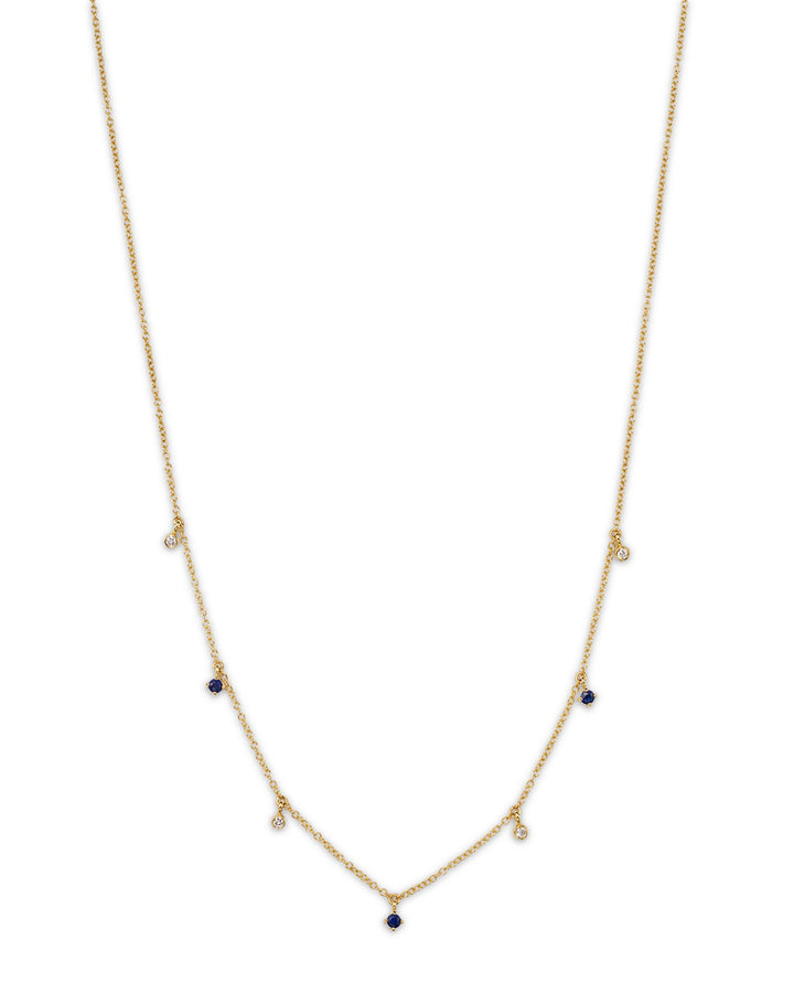 14K Yellow Gold Dangling Station Blue Sapphire & Diamond Necklace, 14'