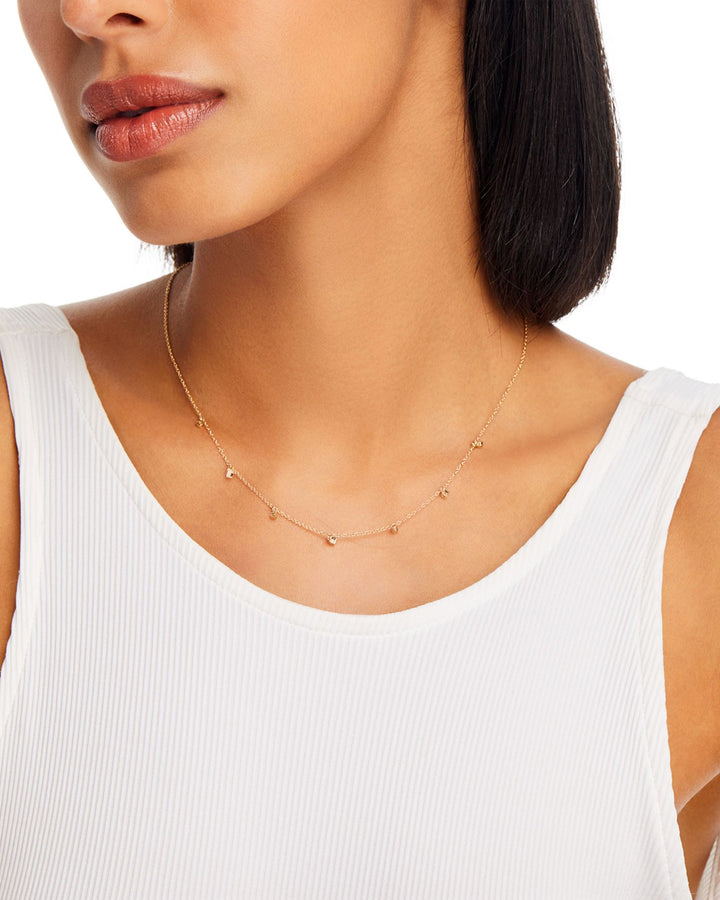 This 14K Yellow Gold Dangling Station Blue Sapphire & Diamond Necklace by Zoë Chicco from the Blue Sapphire Gemstones Collection features an elegant station necklace with dangling blue sapphires and bezel-set white diamonds. The combination of rich blue sapphires and sparkling diamonds adds sophistication and movement to this stunning necklace.