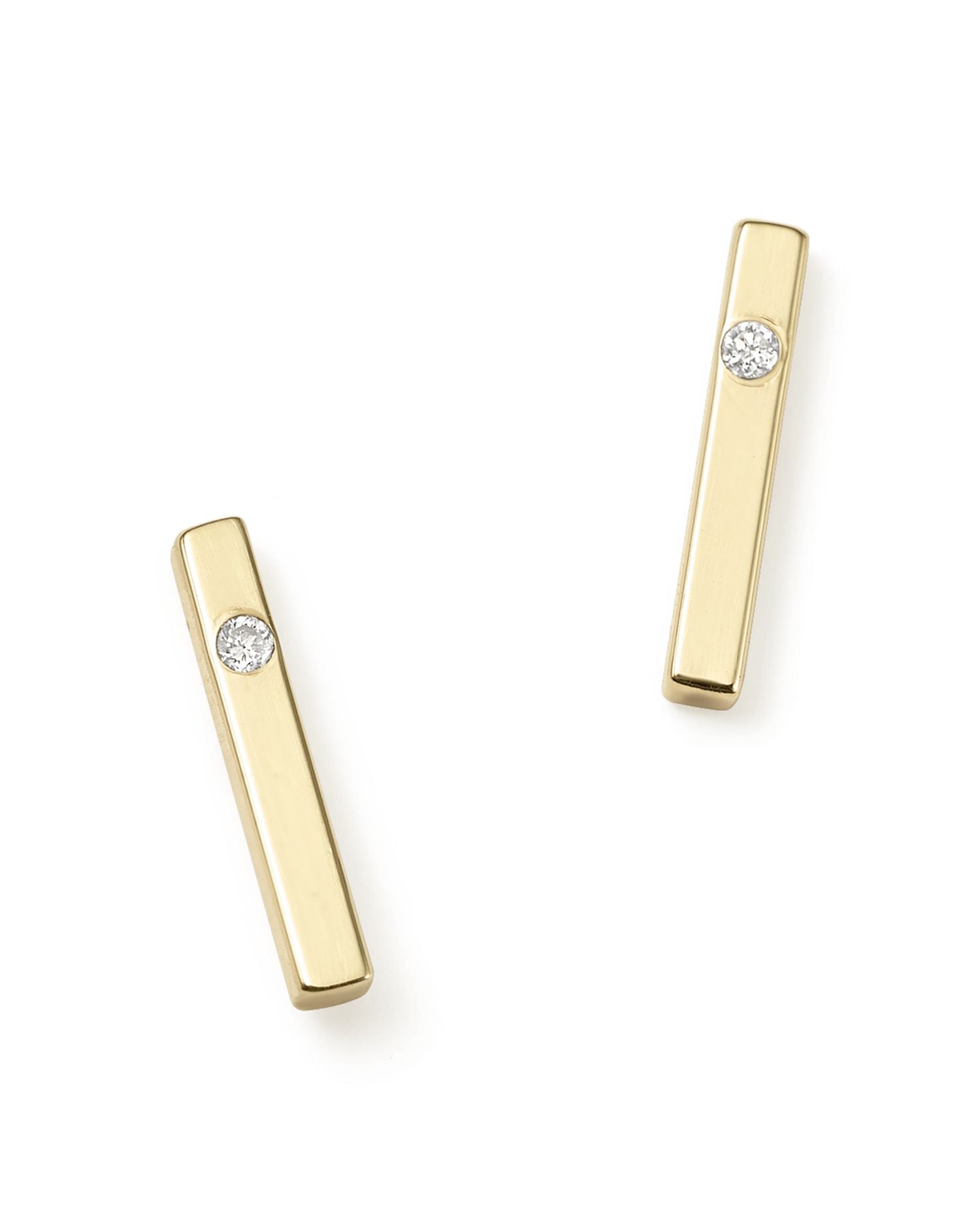 These 14K Yellow Gold Bar Earrings with Diamonds by Zoë Chicco feature simple, elegant bars adorned with diamonds. The minimalist design is perfect for adding a touch of sparkle to any outfit without being overpowering.