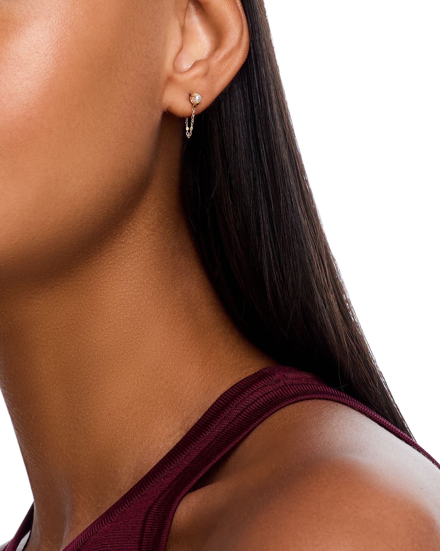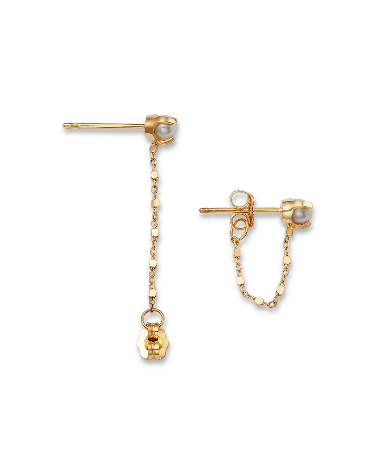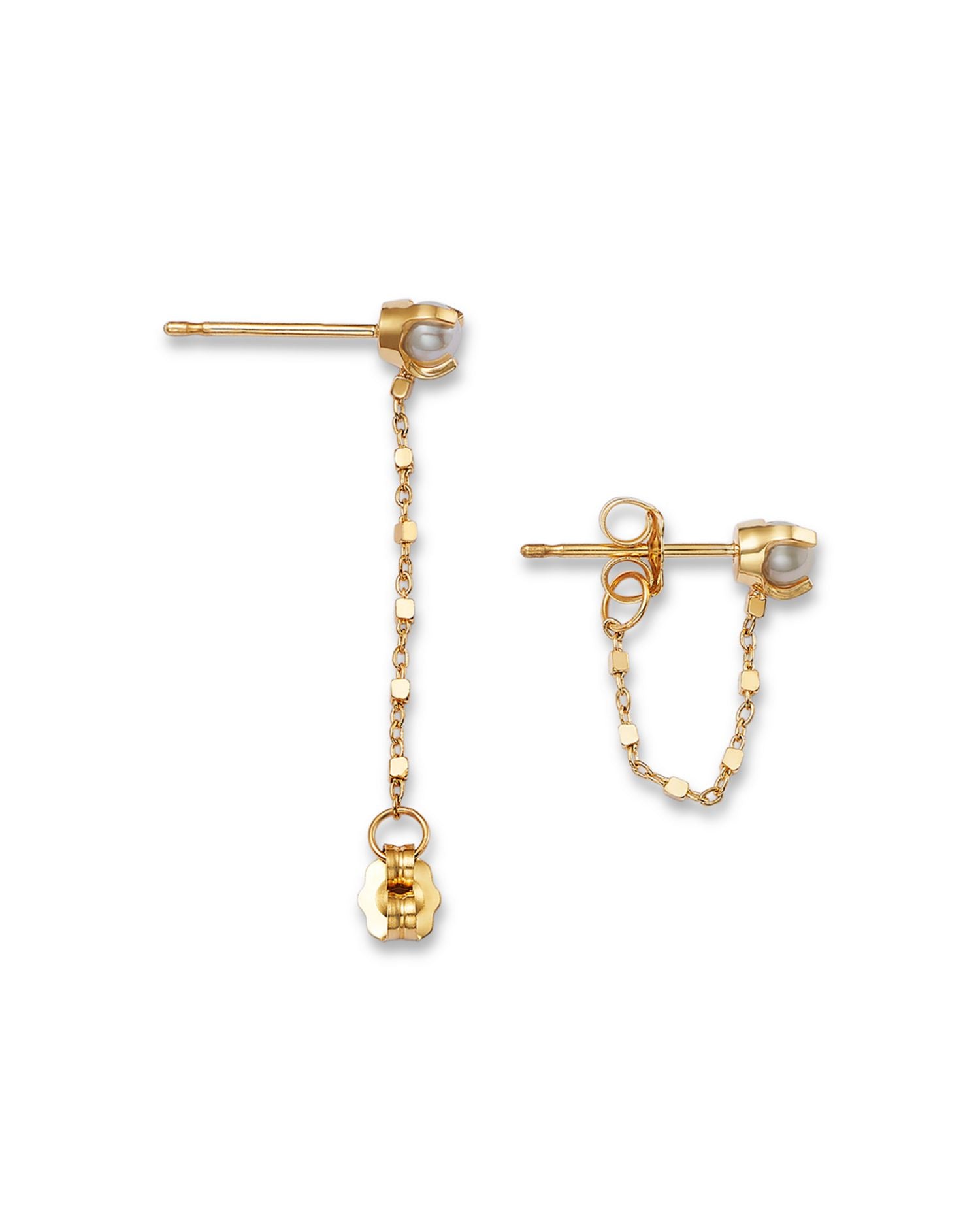 These 14K Yellow Gold Square Bead Chain Cultured Freshwater Pearl Earrings by Zoë Chicco from the White Pearls Collection feature elegant cultured freshwater pearls with a unique square-bead chain that connects the front and back of the earring. The combination of classic pearls and modern design makes these earrings a sophisticated choice.