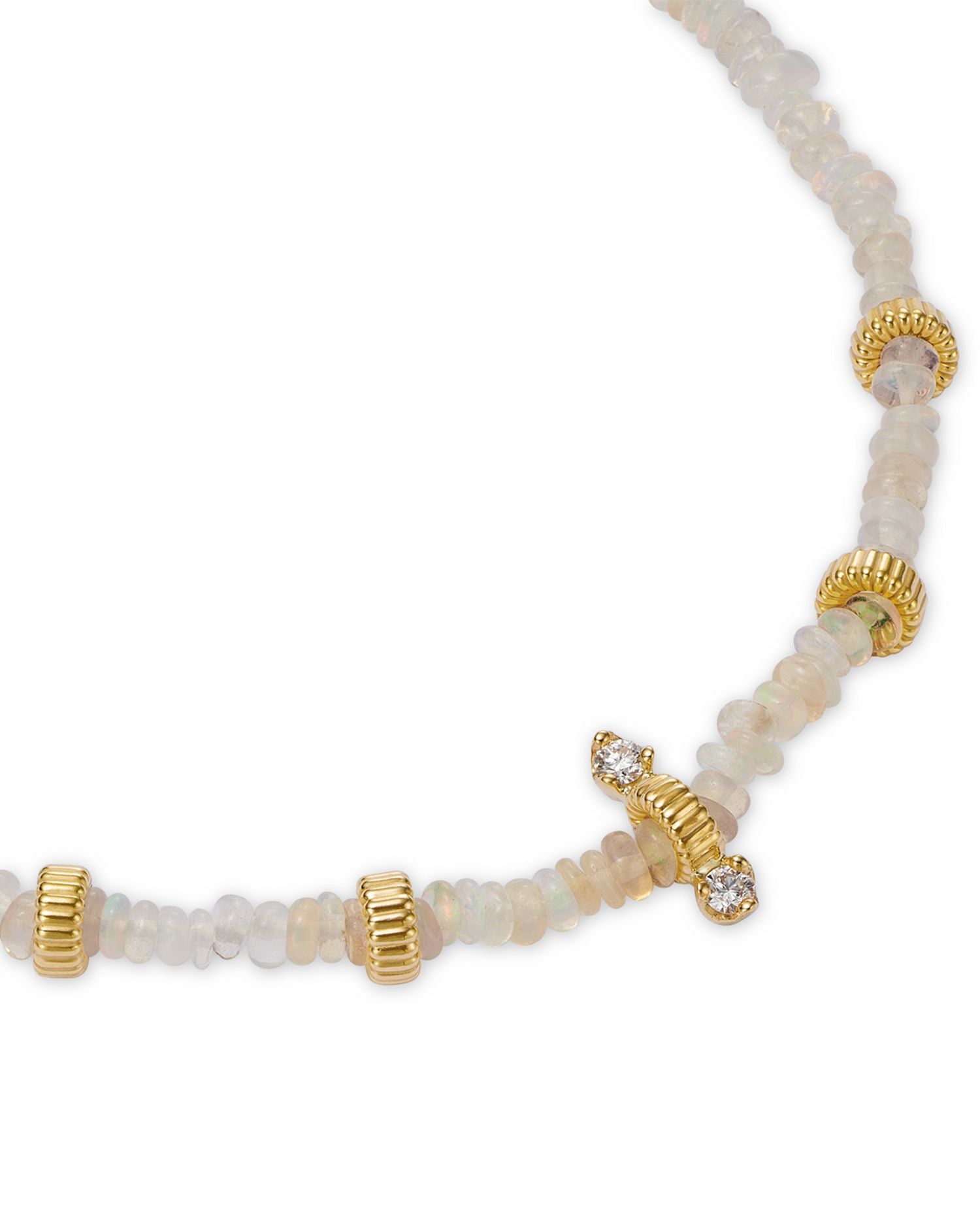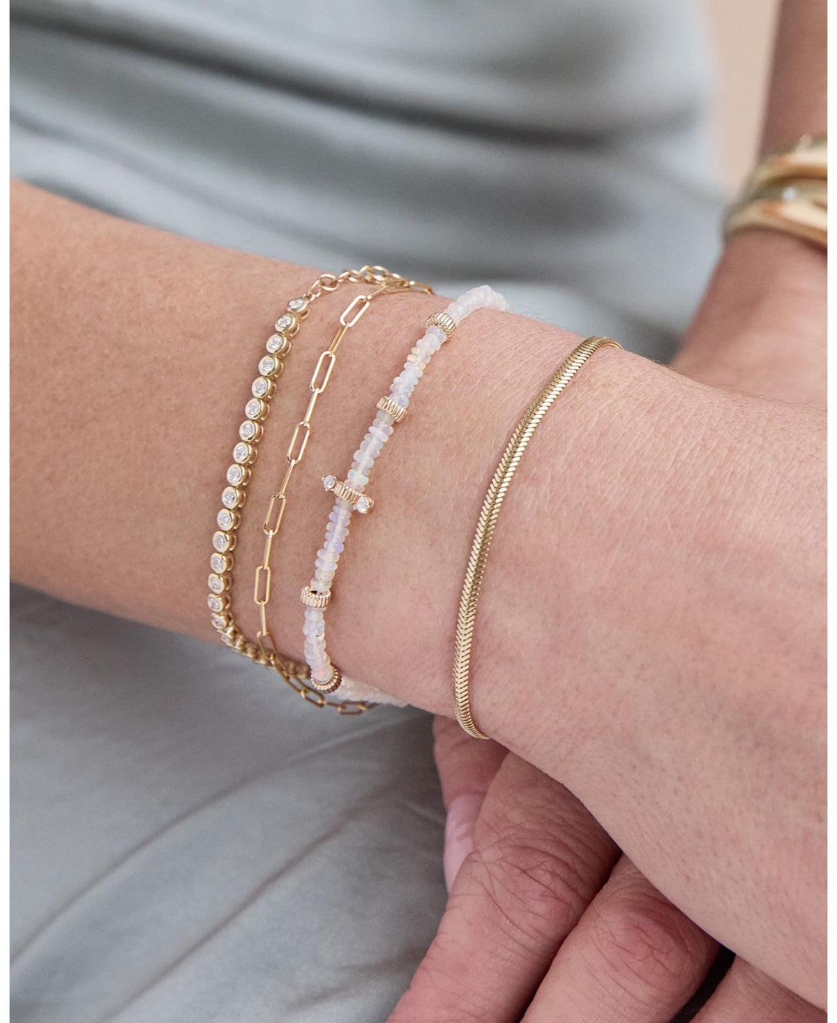 This 14K Yellow Gold Fire Opal Rondelle Bead Bracelet with Diamonds by Zoë Chicco from the Gemstone Beads Collection features translucent fire opal beads that add delicate color and texture, finished with corrugated gold beads and white diamonds. The combination of gemstones and diamonds gives this bracelet a sophisticated and colorful charm.