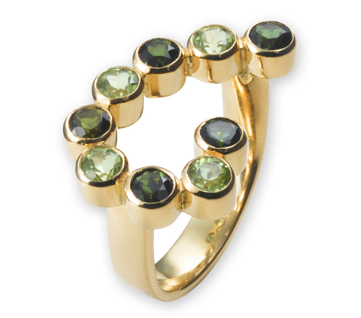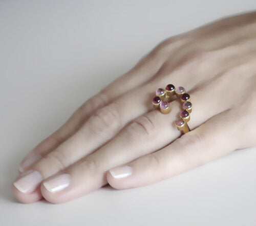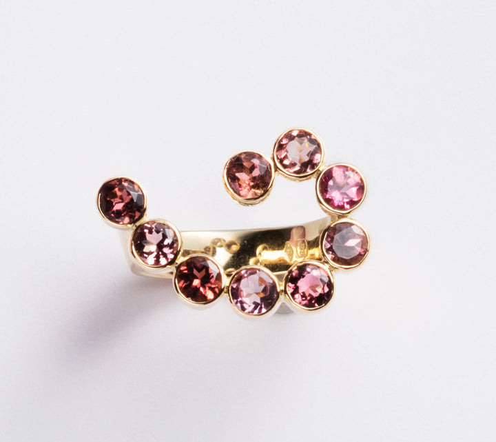 18k yellow or white gold, with pink or green tourmalines.Dimensions: The top of the ring has a size of 23 mm by 15 mm. The back of the ring is 4 mm wide.