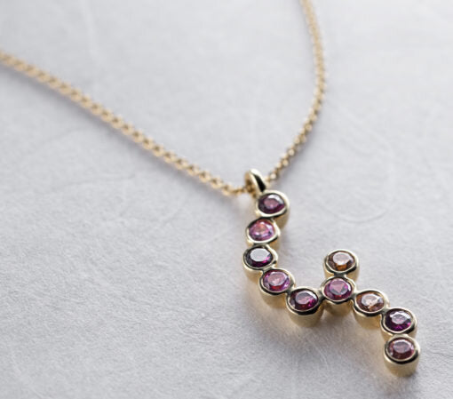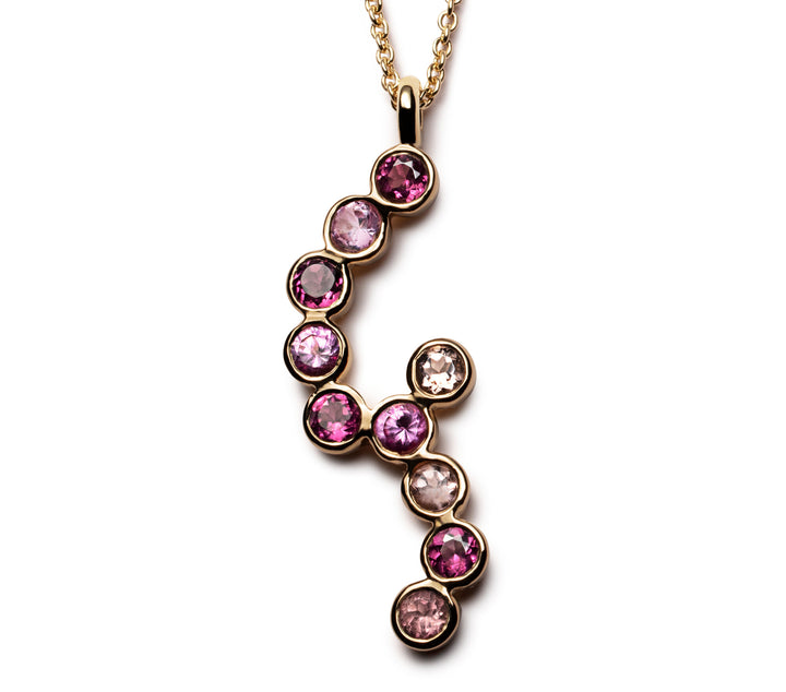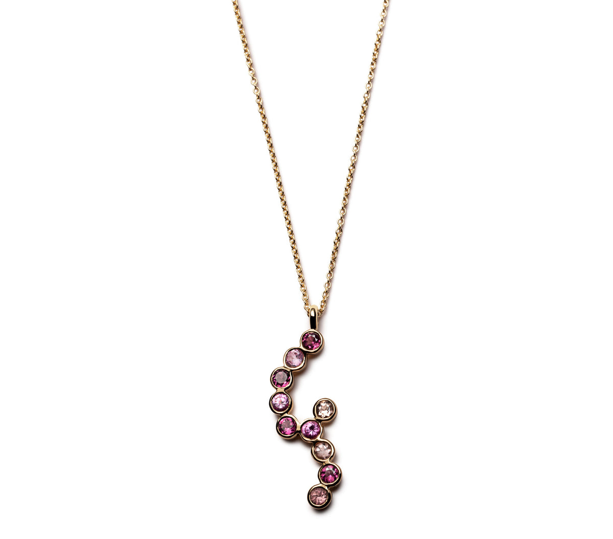 18k yellow gold with pink tourmalines. Also available in 18k white gold and with csarite, green tourmaline, iolite or pink garnets.Dimensions: The pendant has a length of 34,5 mm with the belt. The semi-precious stones are 3 mm.