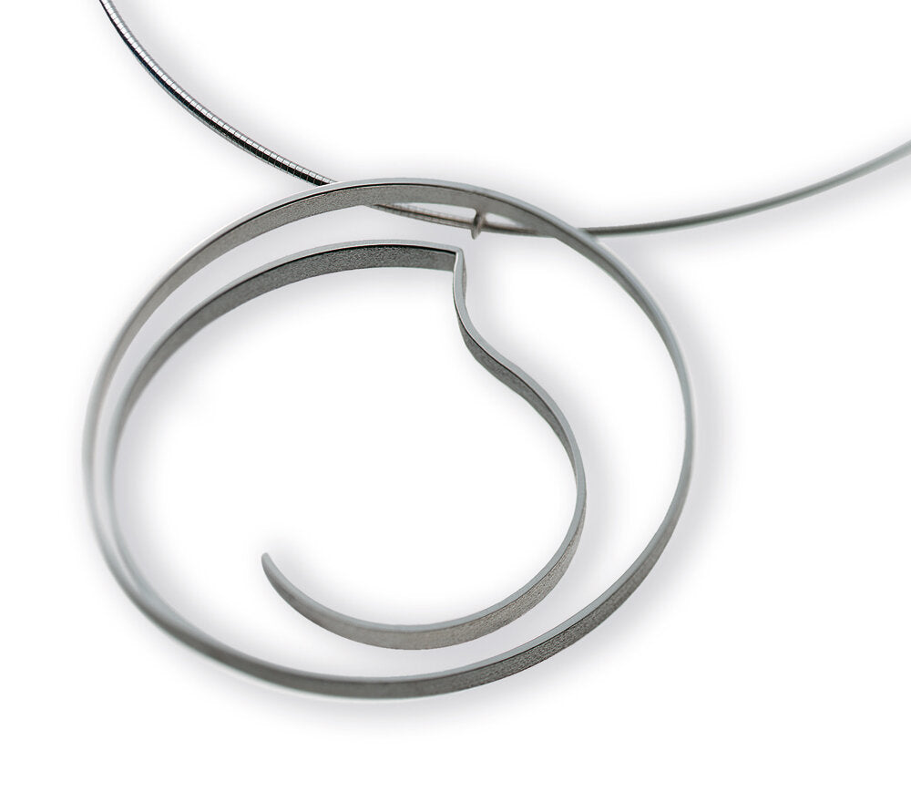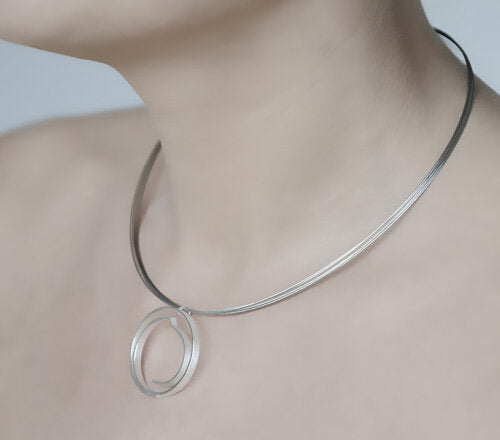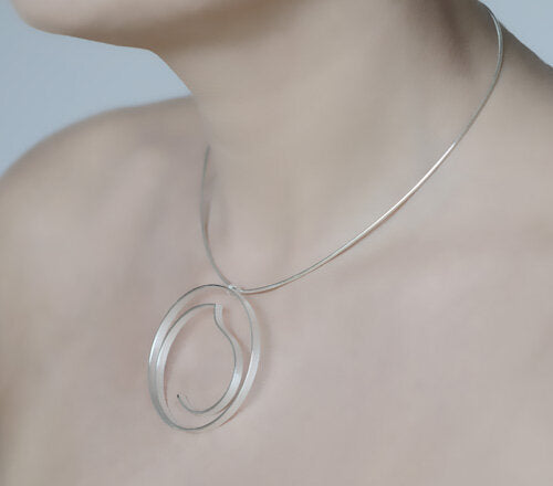 The pendant is made in sterling silver. Two chain models are proposed: a five wire steel chain or a silver Omega chain.Dimensions: This pendant is available in 2 sizes: small and big. For the small, the diameter is 30 mm. For the big, the diameter is 50 mm.