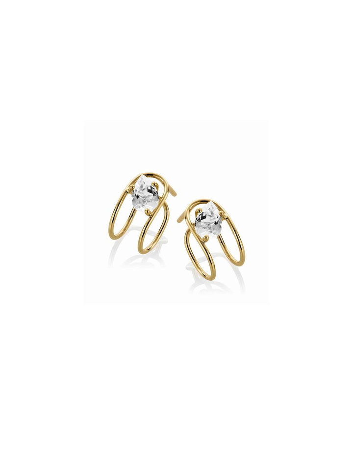For her Double C collection, Natalie Schayes has designed an earring with a white topaz stone interlaced between golden lines. The stone nestles near the ear for a minimalist and chic aesthetic. These modern earrings can be worn as much on a daily basis as for a special occasion. Wear this model as a pair or as a mono earring. Sold by pair.