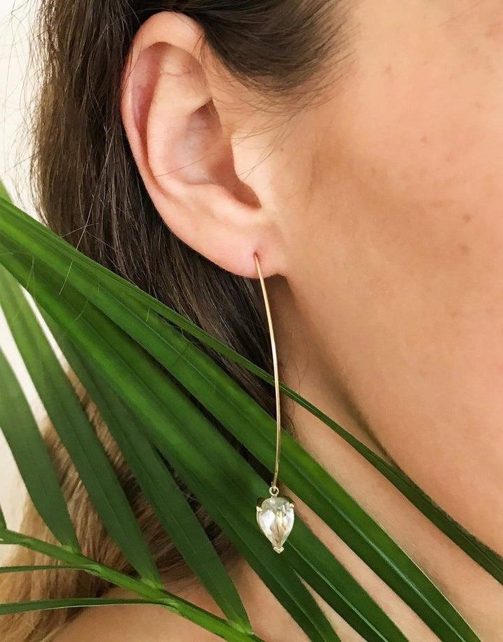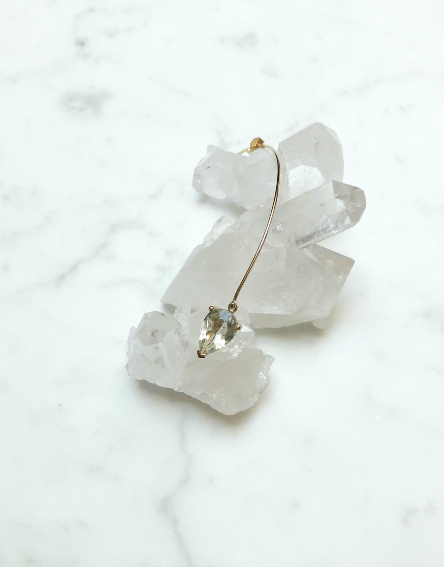 For her Signature collection, Natalie Schayes has designed an earring set with recognizable pear shaped stone, the amethyst. As the perfect minimalist jewel, the designer imagined an earring to be worn everyday. The earring falls gently from the ear and accentuates the neck with the stone at the end. Wear this model as a pair or as a mono earring. Sold individually.